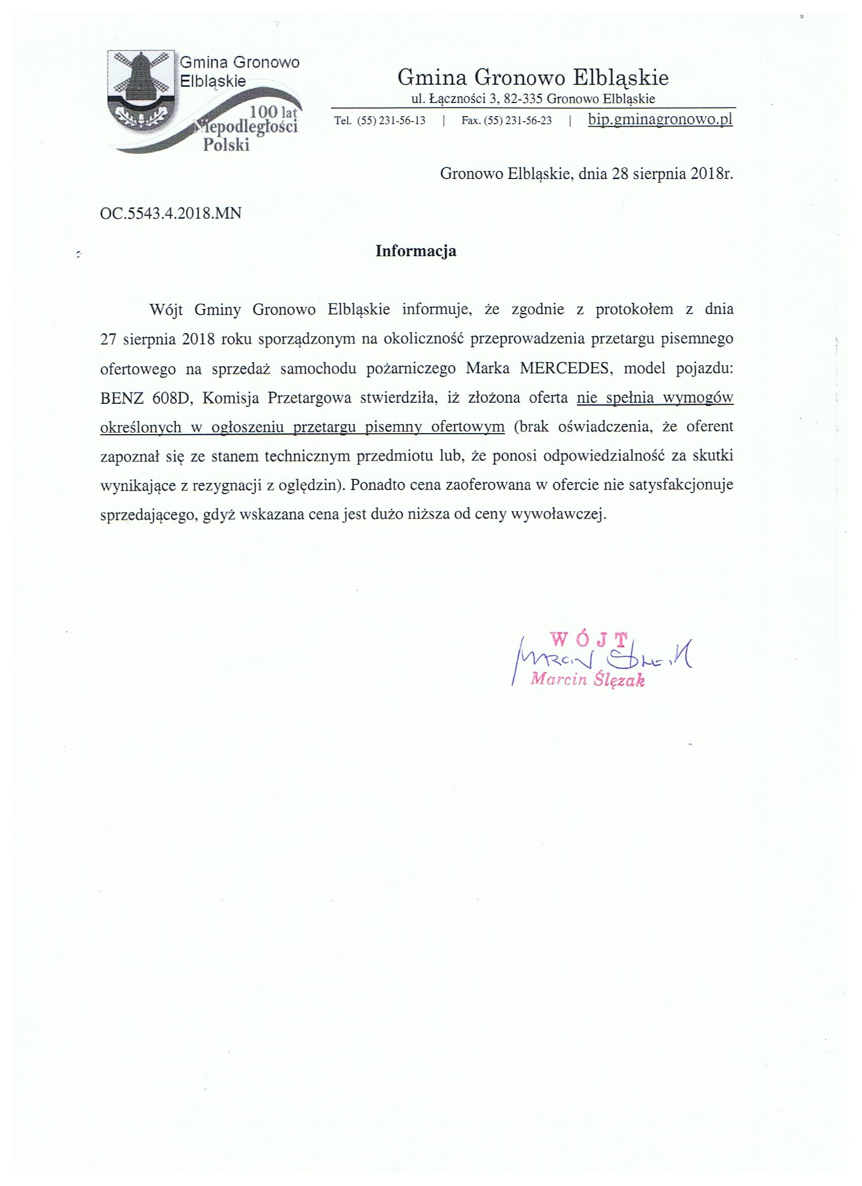 Ogloszenie o przetargu pisemnym ofertowym nieograniczonym na sprzedaż samochodu strażackiego