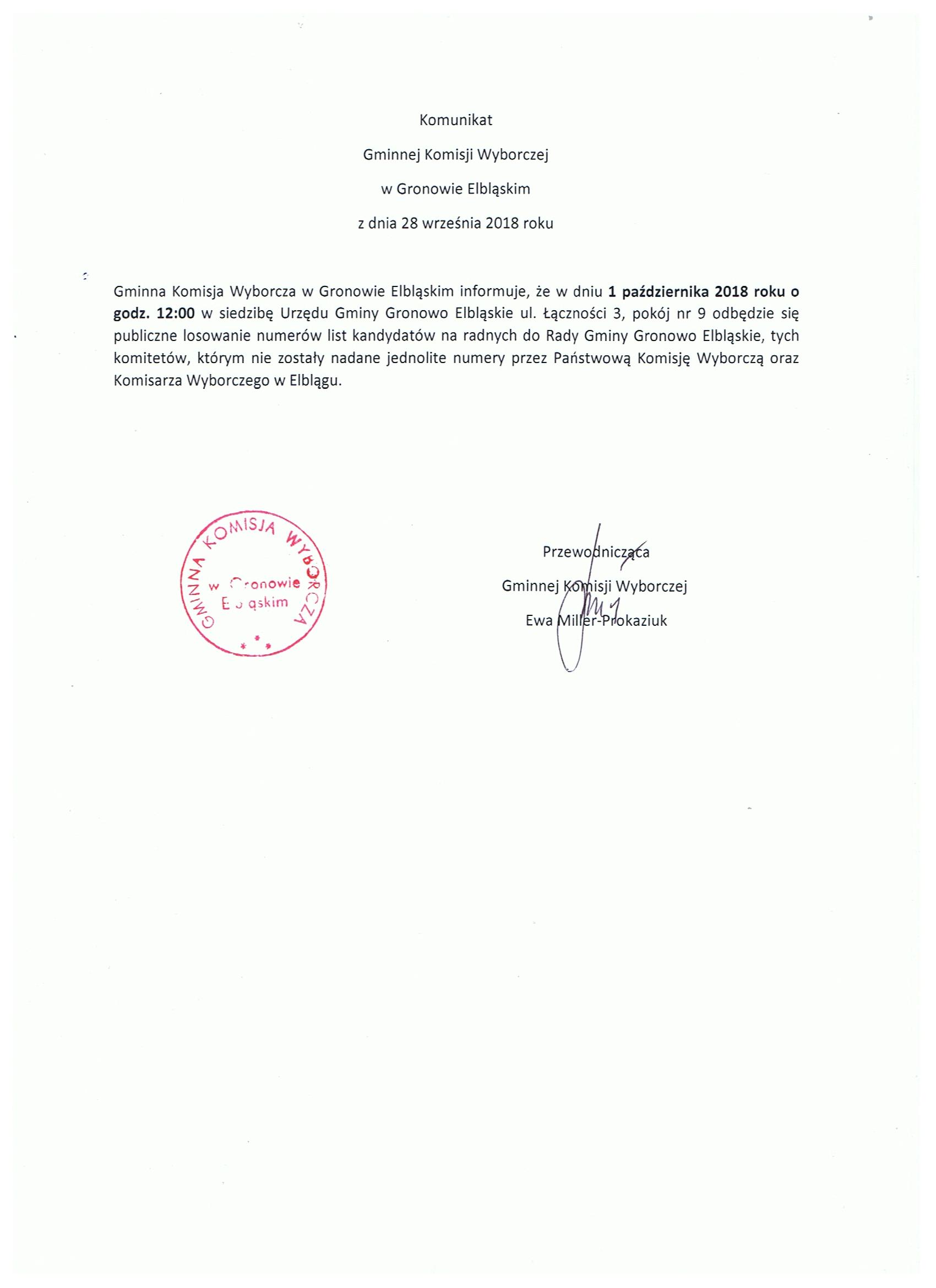 Wersja obowiązująca z dnia 28-09-2018 12:41:32 Drukuj Komunikat Gminnej Komisji Wyborczej w Gronowie Elbląskim z dnia 28 września 2018 roku w sprawie losowania numerów list kandydatów na radnych Załączniki Komunukat GKW z dnia 28 września 2018 roku w sprawie losowania numerów list format: image/jpeg, rozmiar: 141.55 KB, data dodania: 28-09-2018 12:41:32