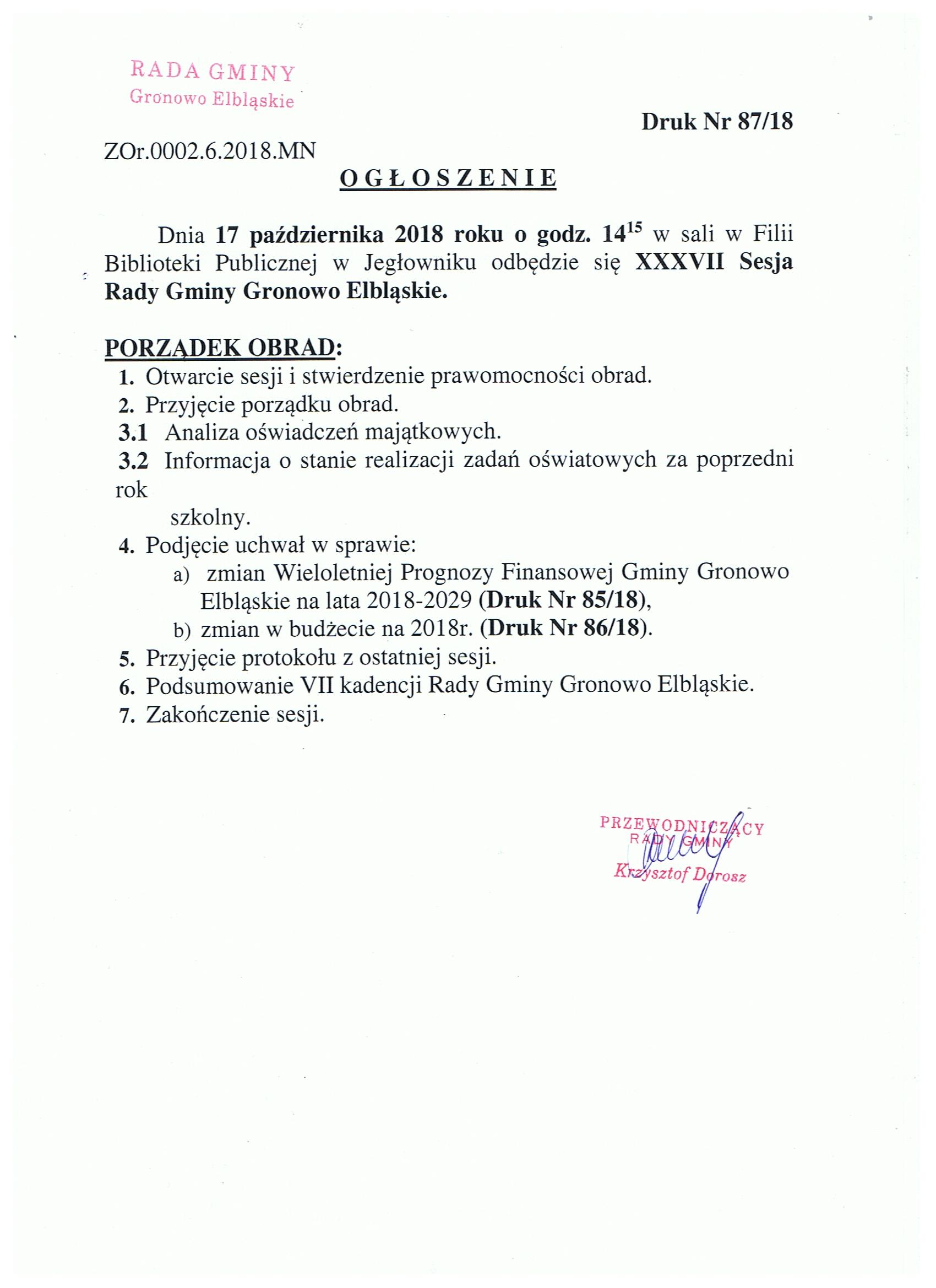 Dnia 17 października 2018 roku o godz. 1415 w sali w Filii Biblioteki Publicznej w Jegłowniku odbędzie się XXXVII Sesja Rady Gminy Gronowo Elbląskie.