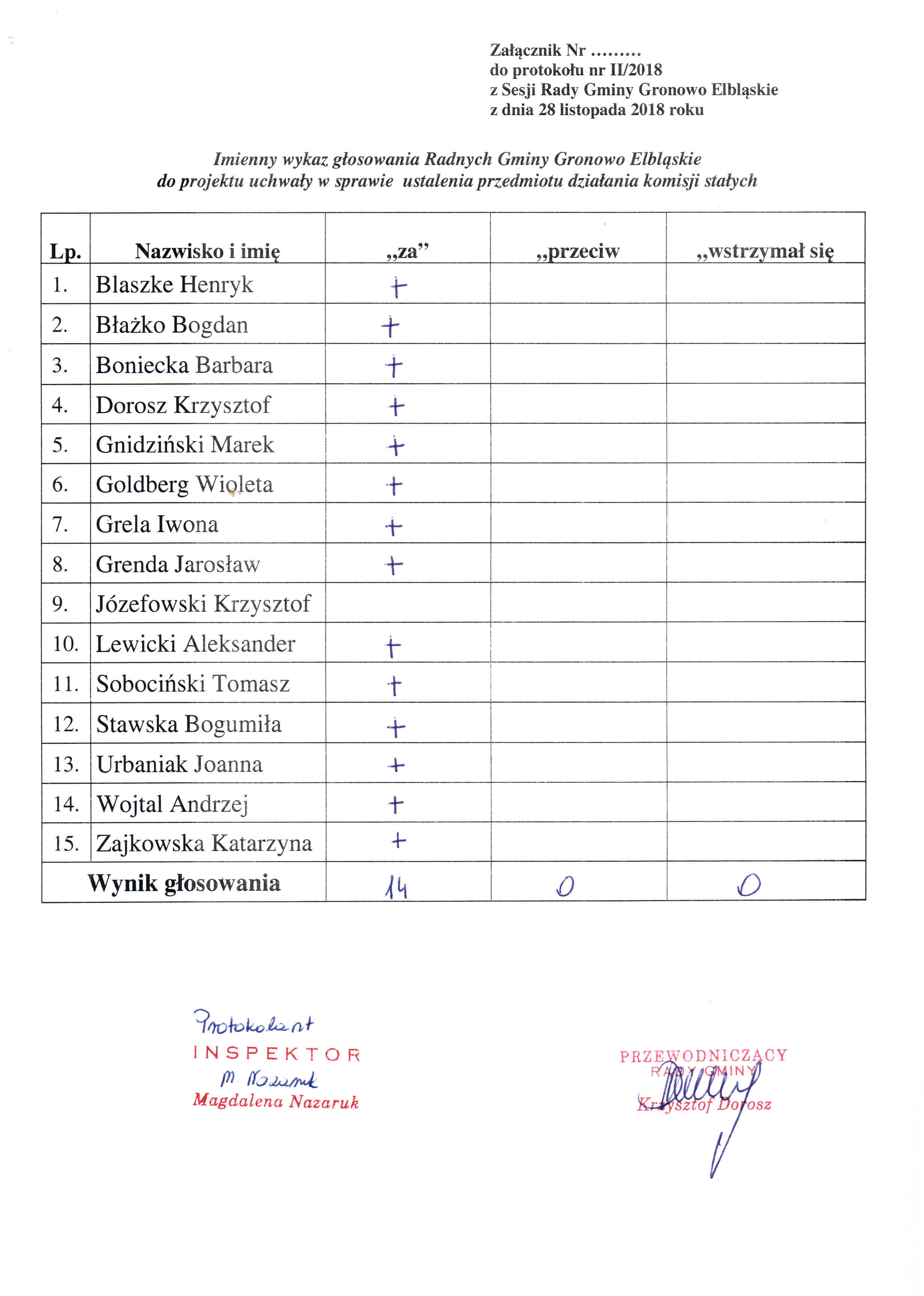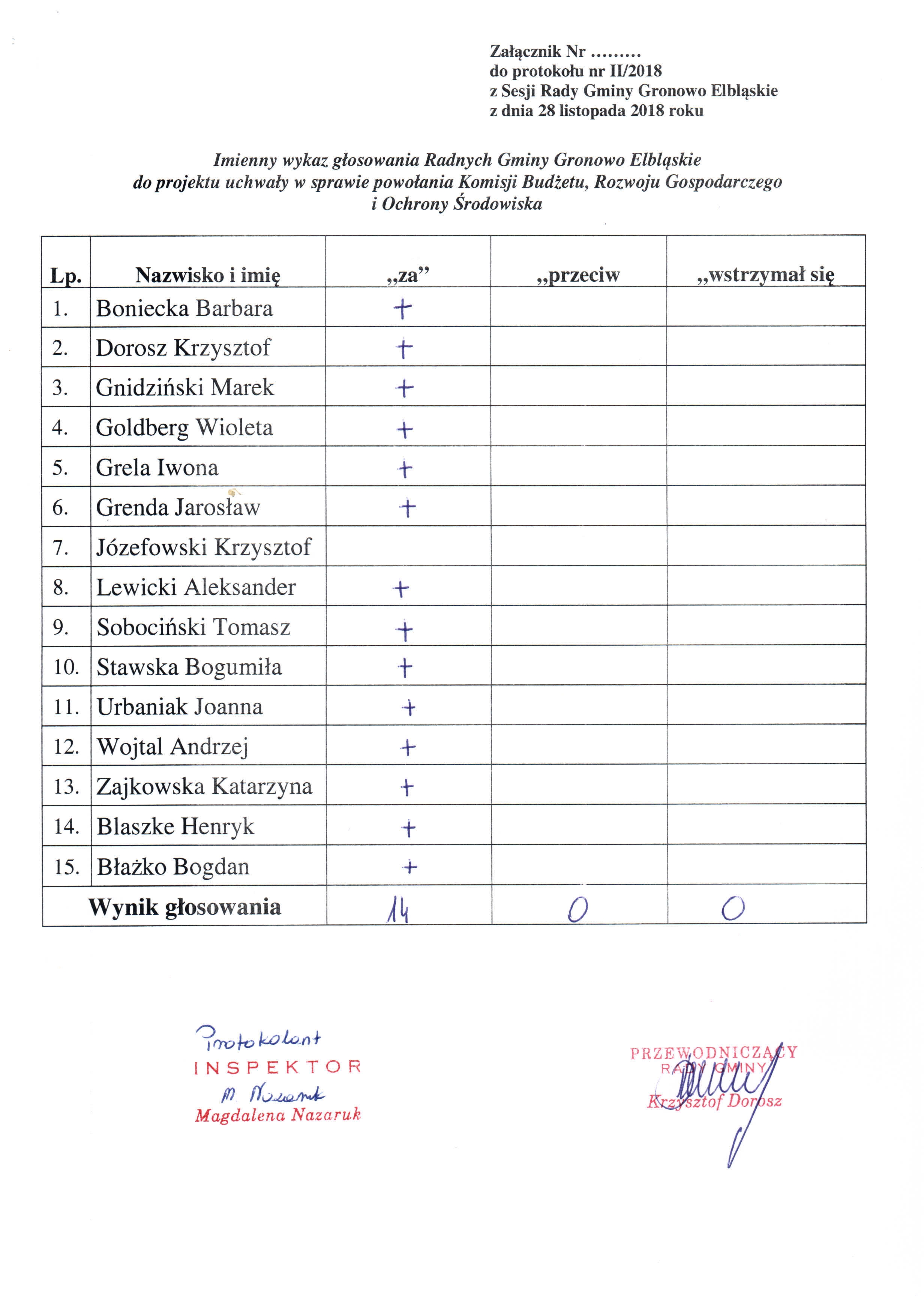 - pkt. 4 d - Imienny wykaz głosowania Radnych Gminy Gronowo Elbląskie w sprawie powołania Komisji Budżetu, Rozwoju Gospodarczego i Ochrony Środowiska