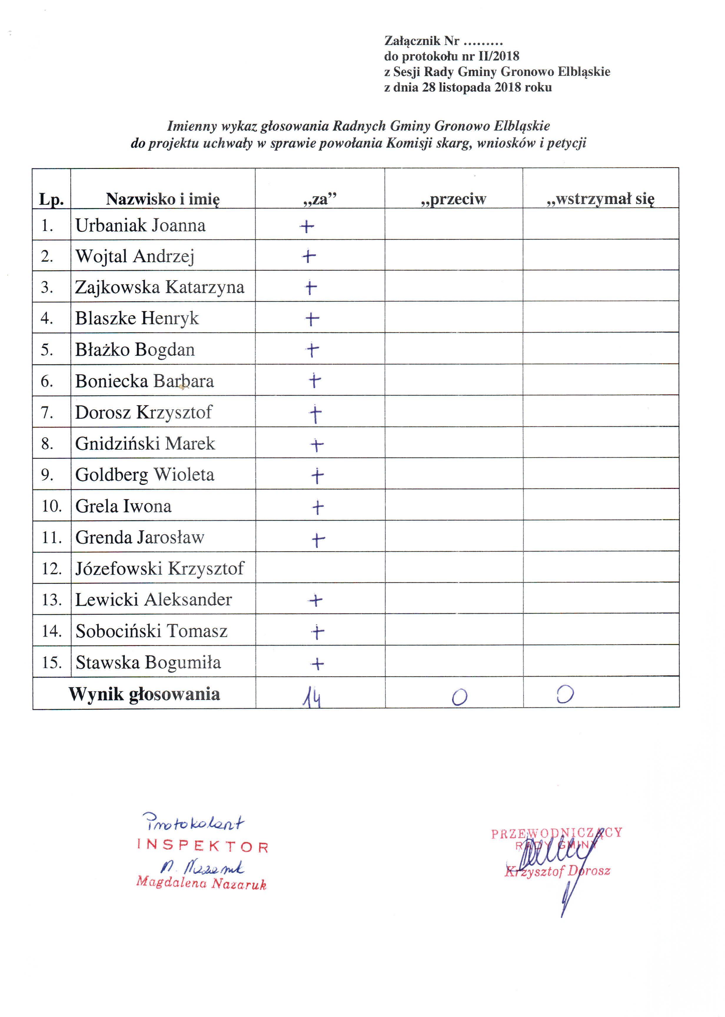 - pkt. 4 c - Imienny wykaz głosowania Radnych Gminy Gronowo Elbląskie w sprawie powołania Komisji skarg, wniosków i petycji