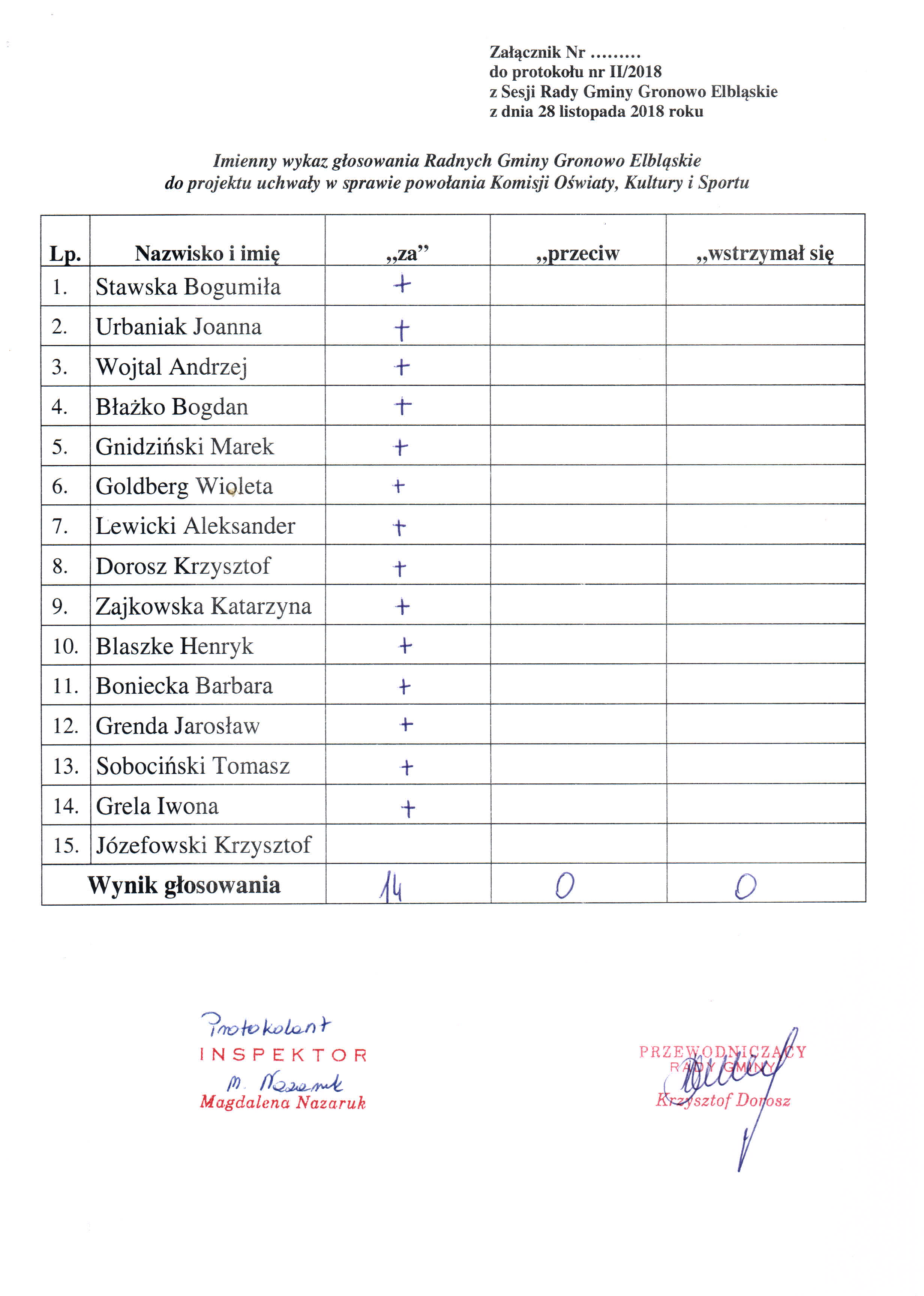 - pkt. 4 e - Imienny wykaz głosowania Radnych Gminy Gronowo Elbląskie w sprawie powołania Komisji Oświaty, Kultury i Sportu