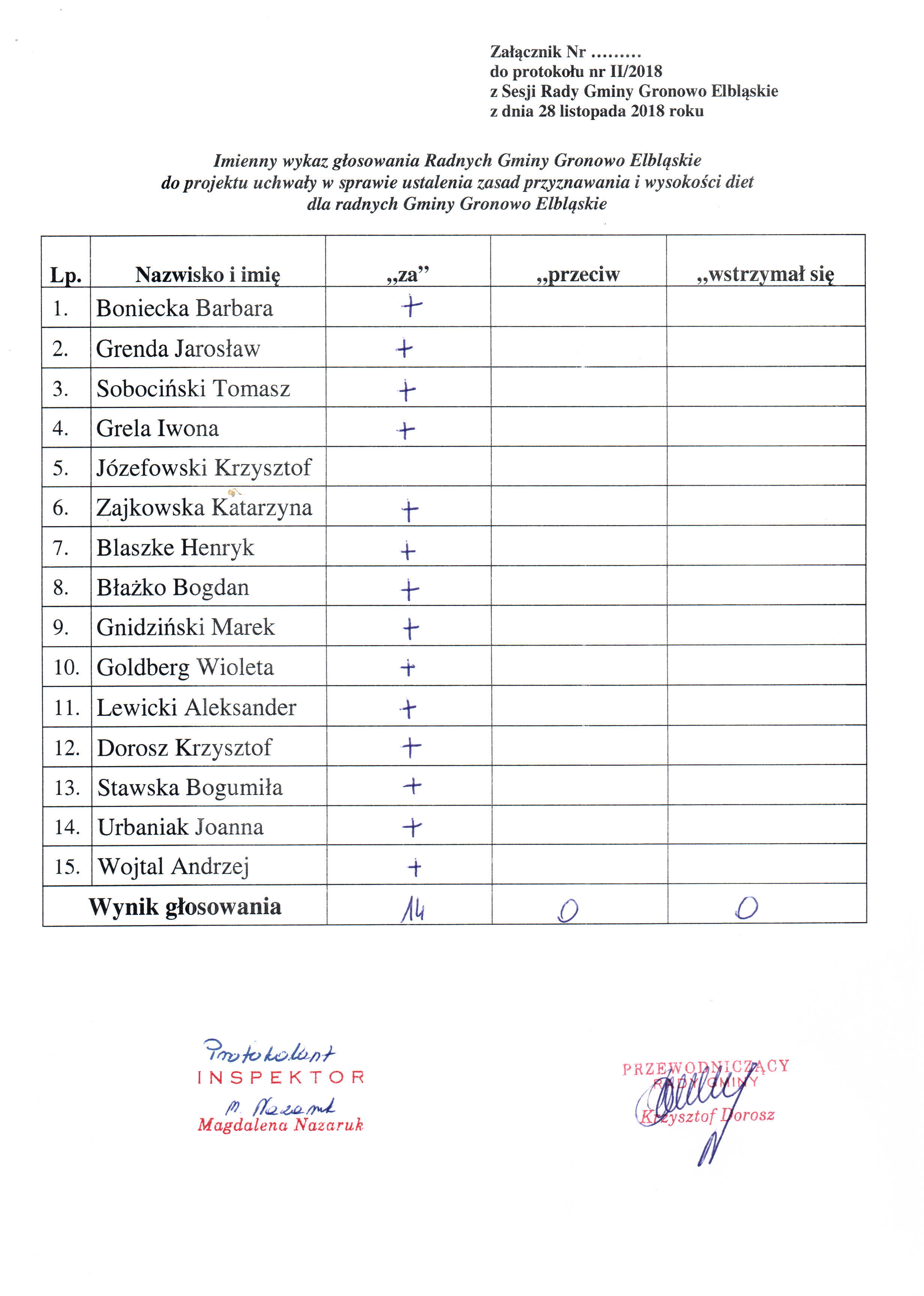 - pkt. 4 f - Imienny wykaz głosowania Radnych Gminy Gronowo Elbląskie w sprawie ustalenia zasad przyznawania i wysokości diet dla radnych Gminy Gronowo Elbląskie