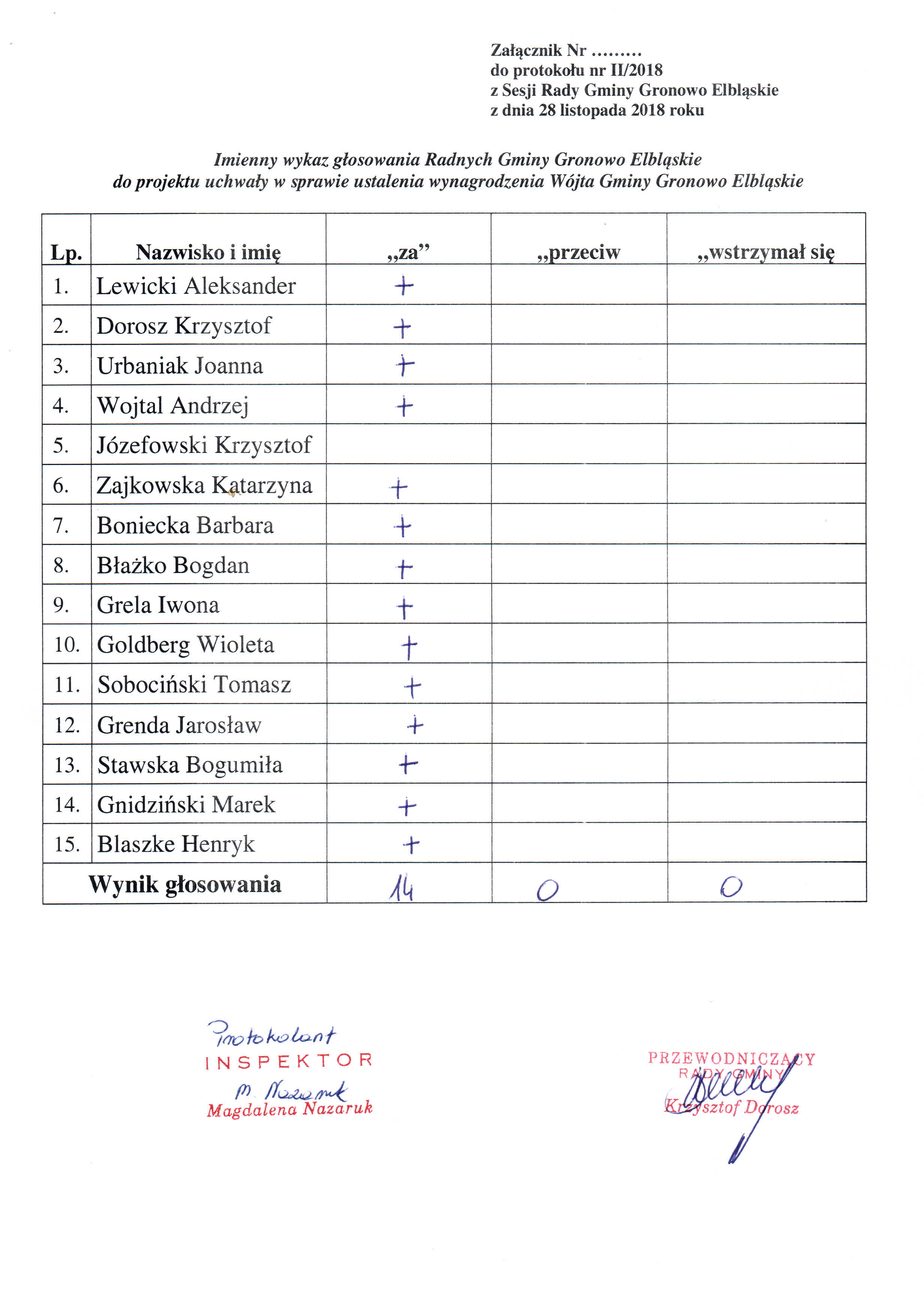 - pkt. 4 g - Imienny wykaz głosowania Radnych Gminy Gronowo Elbląskie w sprawie ustalenia wynagrodzenia Wójta Gminy Gronowo Elbląskie