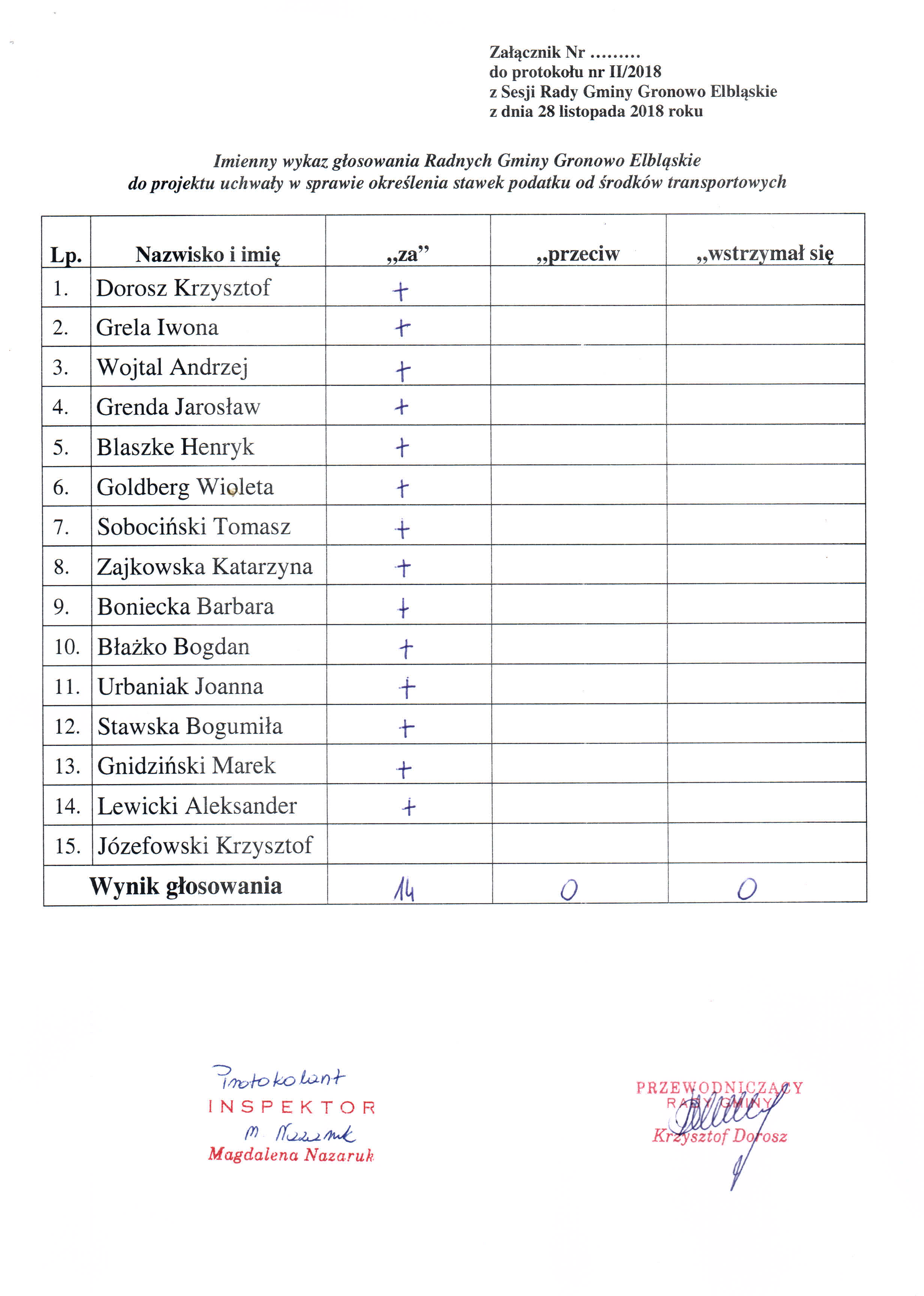 - pkt. 4 i - Imienny wykaz głosowania Radnych Gminy Gronowo Elbląskie w sprawie określenia stawek podatku od środków transportowych