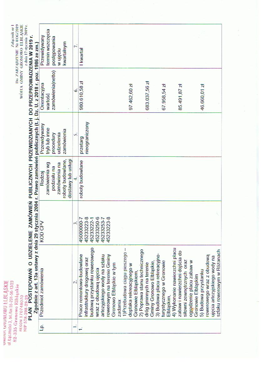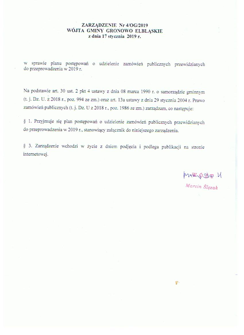 Zarządzenie Nr 4./0G/2019 Wójta Gminy Gronowo Elbląskie z dnia 17.01.2019r. w sprawie planu postępowań o udzielenie zamówień publicznych przewidzianych do przeprowadzenia w 2019r.