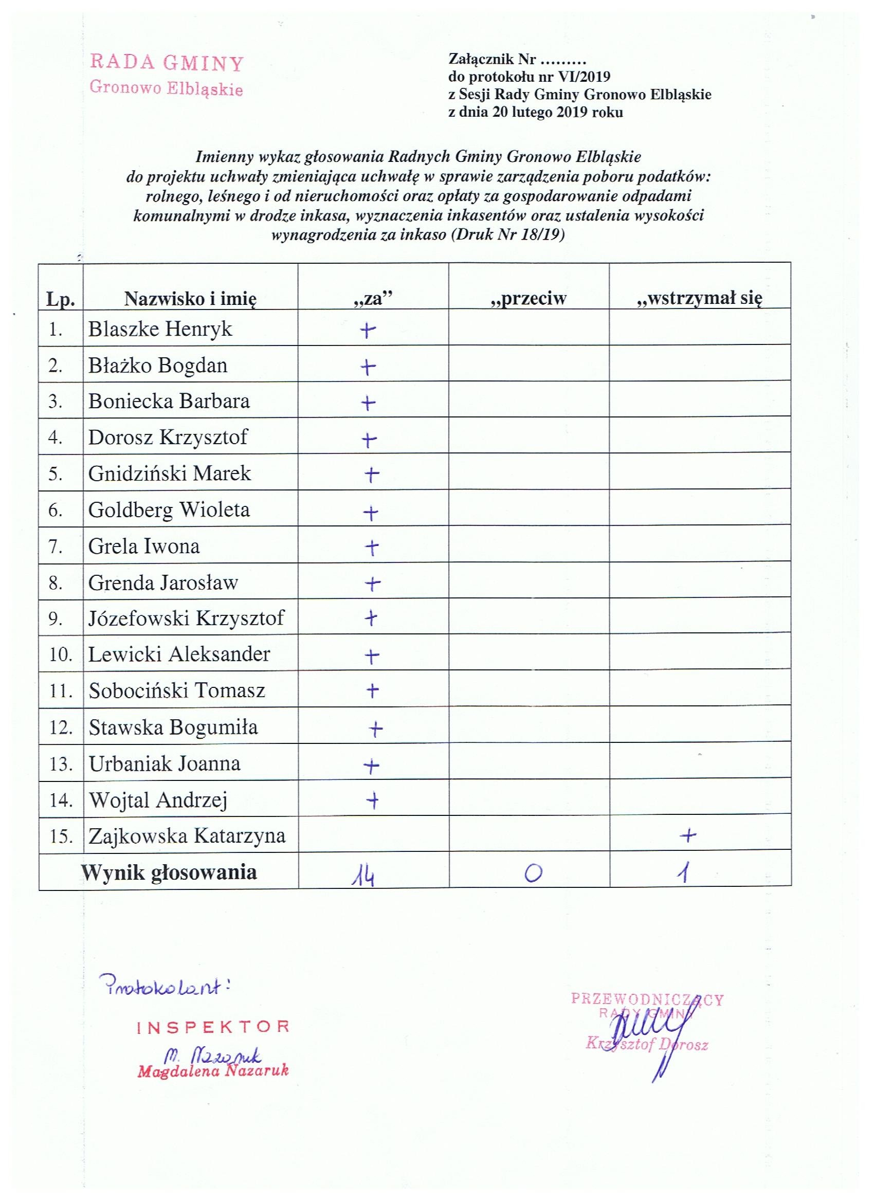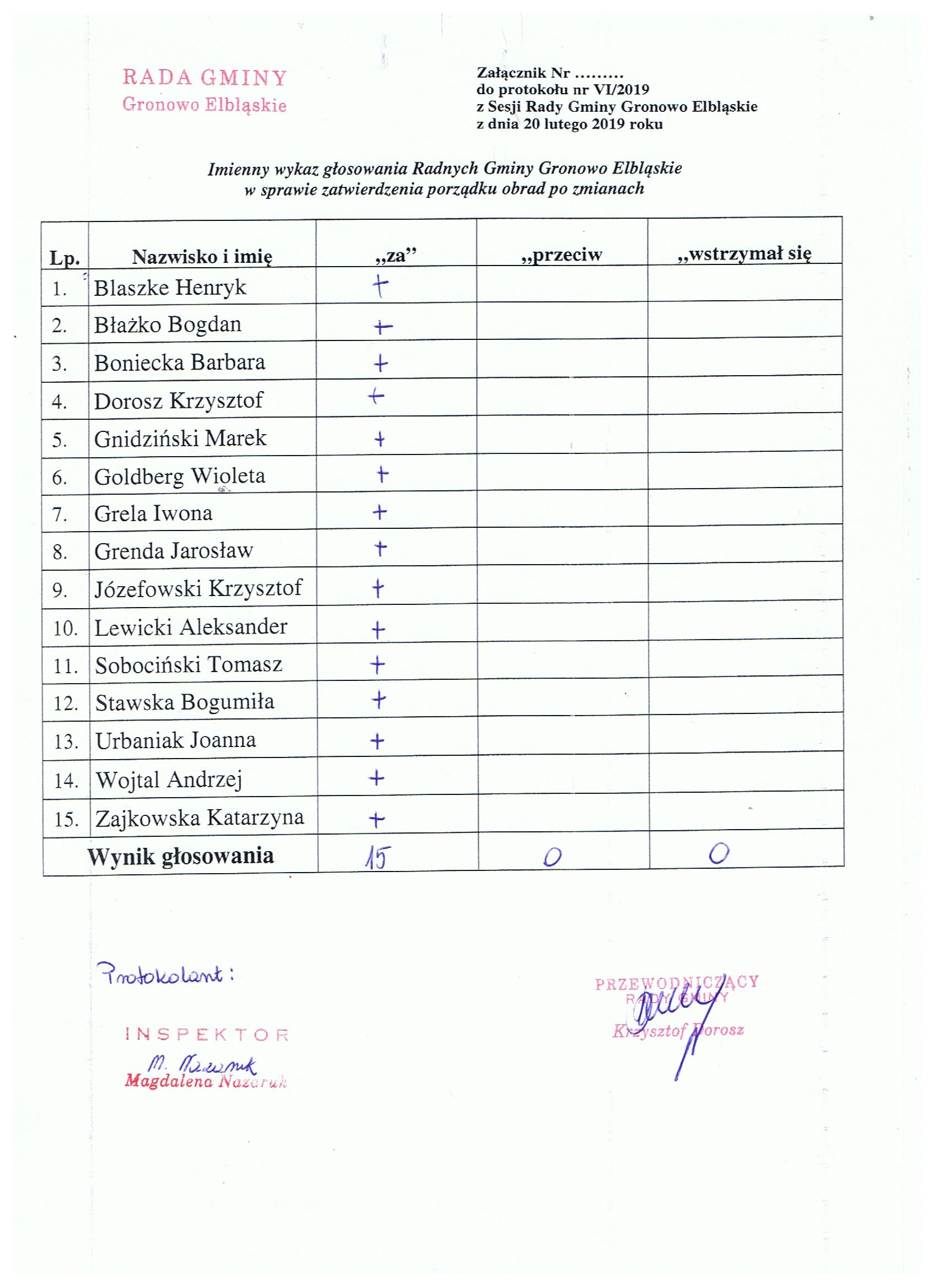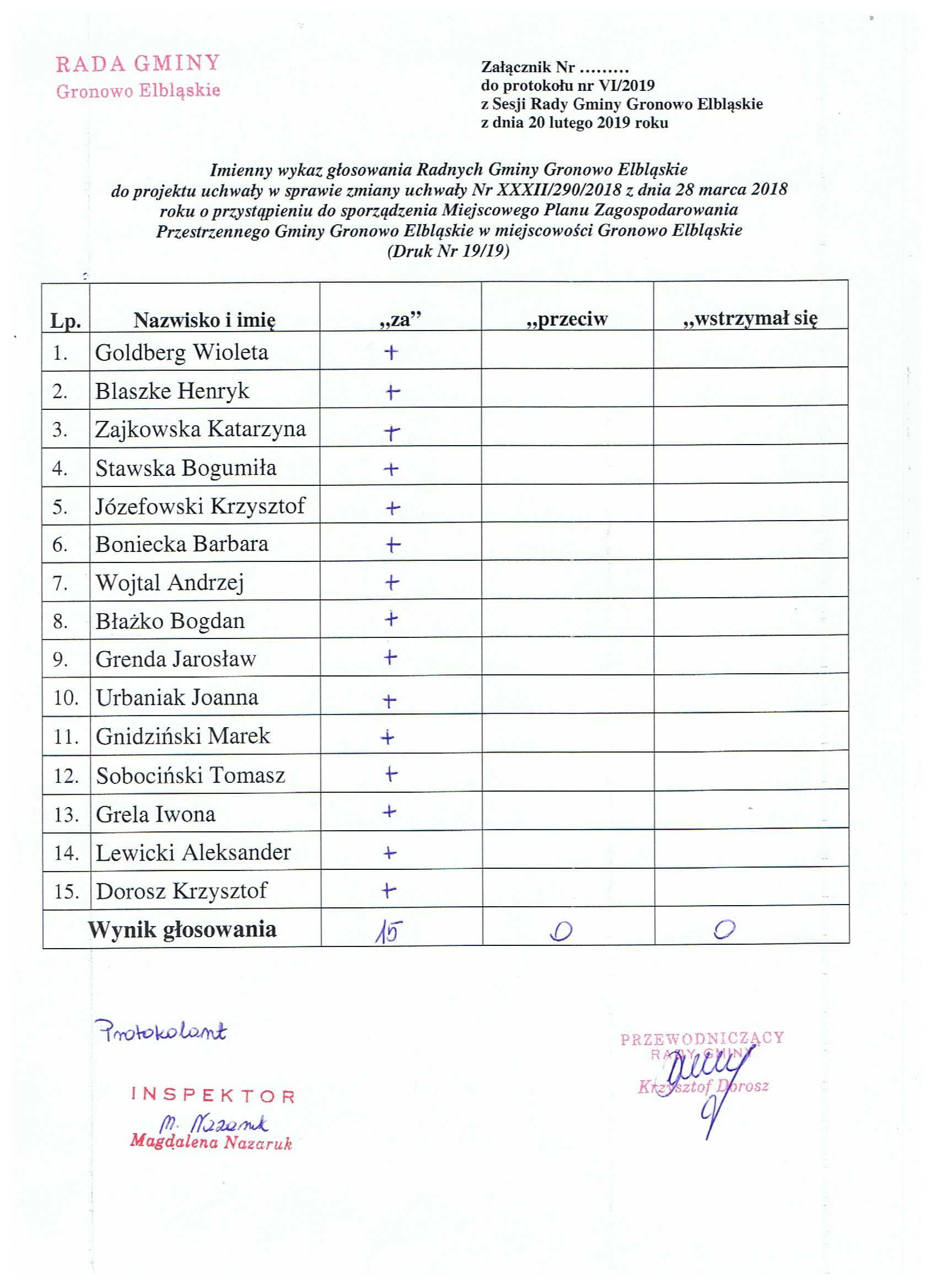 - pkt. 5 b - Głosowanie imienne do projektu uchwały w sprawie zmiany uchwały Nr XXXII/290/2018 z dnia 28 marca 2018 roku o przystąpieniu do sporządzenia Miejscowego Planu Zagospodarowania Przestrzennego Gminy Gronowo Elbląskie w miejscowości Gronowo Elbląskie