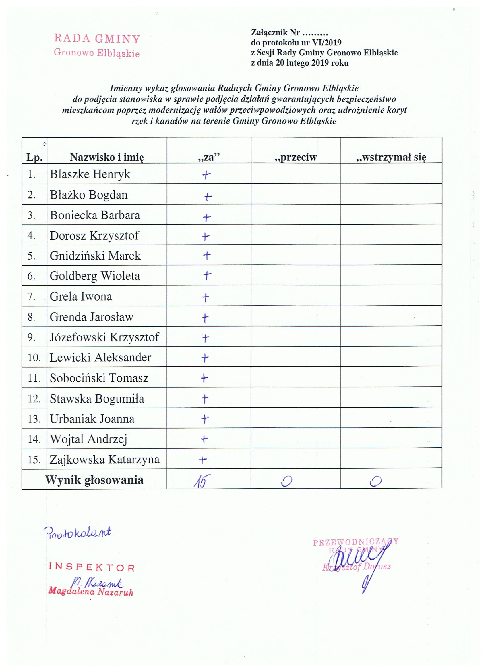 - pk. 4 - Głosowanie imienne w sprawie podjęcia stanowiska w sprawie podjęcia działań gwarantujących bezpieczeństwo mieszkańcom poprzez modernizację wałów przeciwpowodziowych oraz udrożnienie koryt rzek i kanałów na terenie Gminy Gronowo Elbląskie