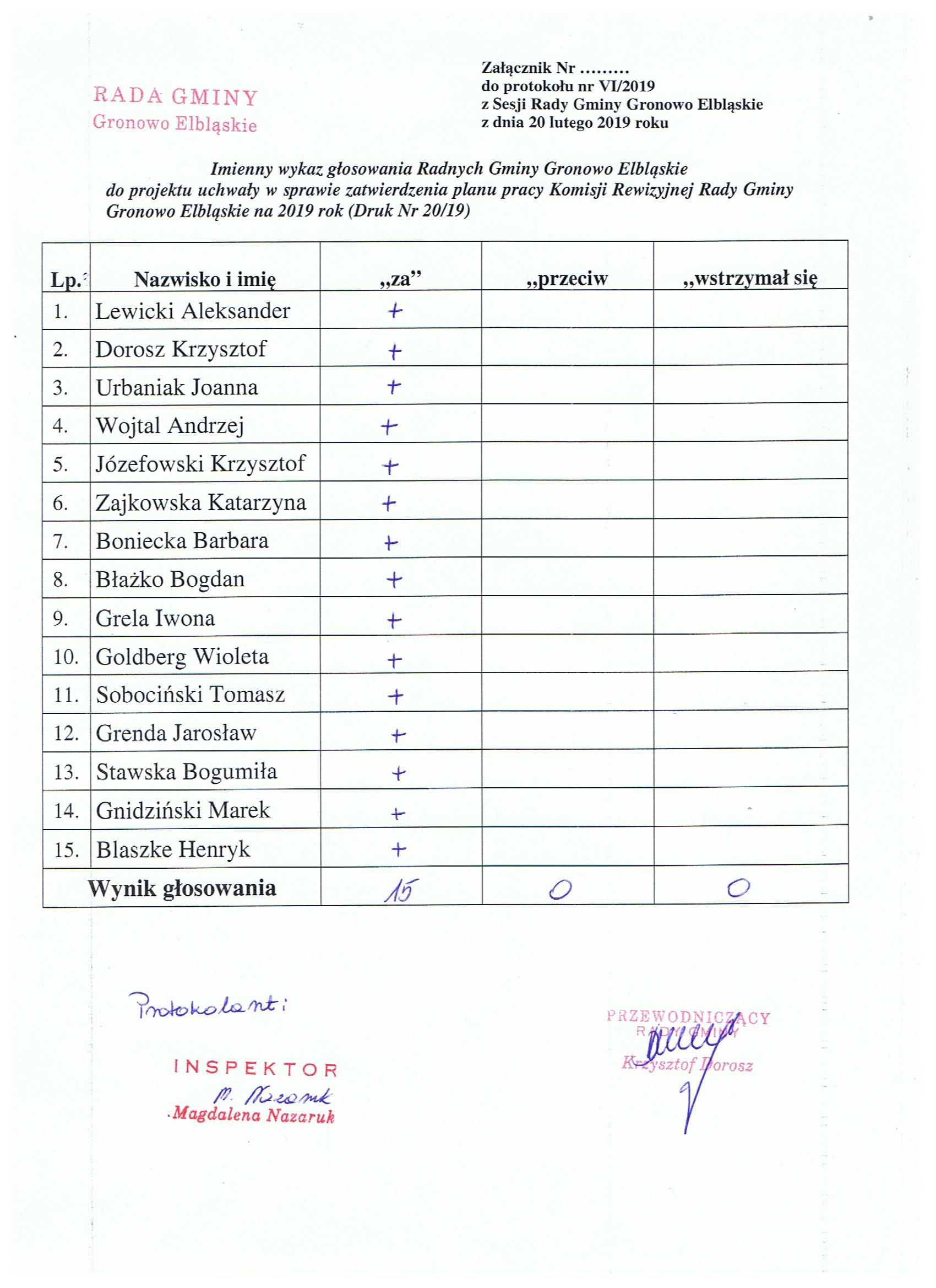 - pk. 5 c - Głosowanie imienne w sprawie zatwierdzenia planu pracy Komisji Rewizyjnej Rady Gminy Gronowo Elbląskie na 2019 rok013
