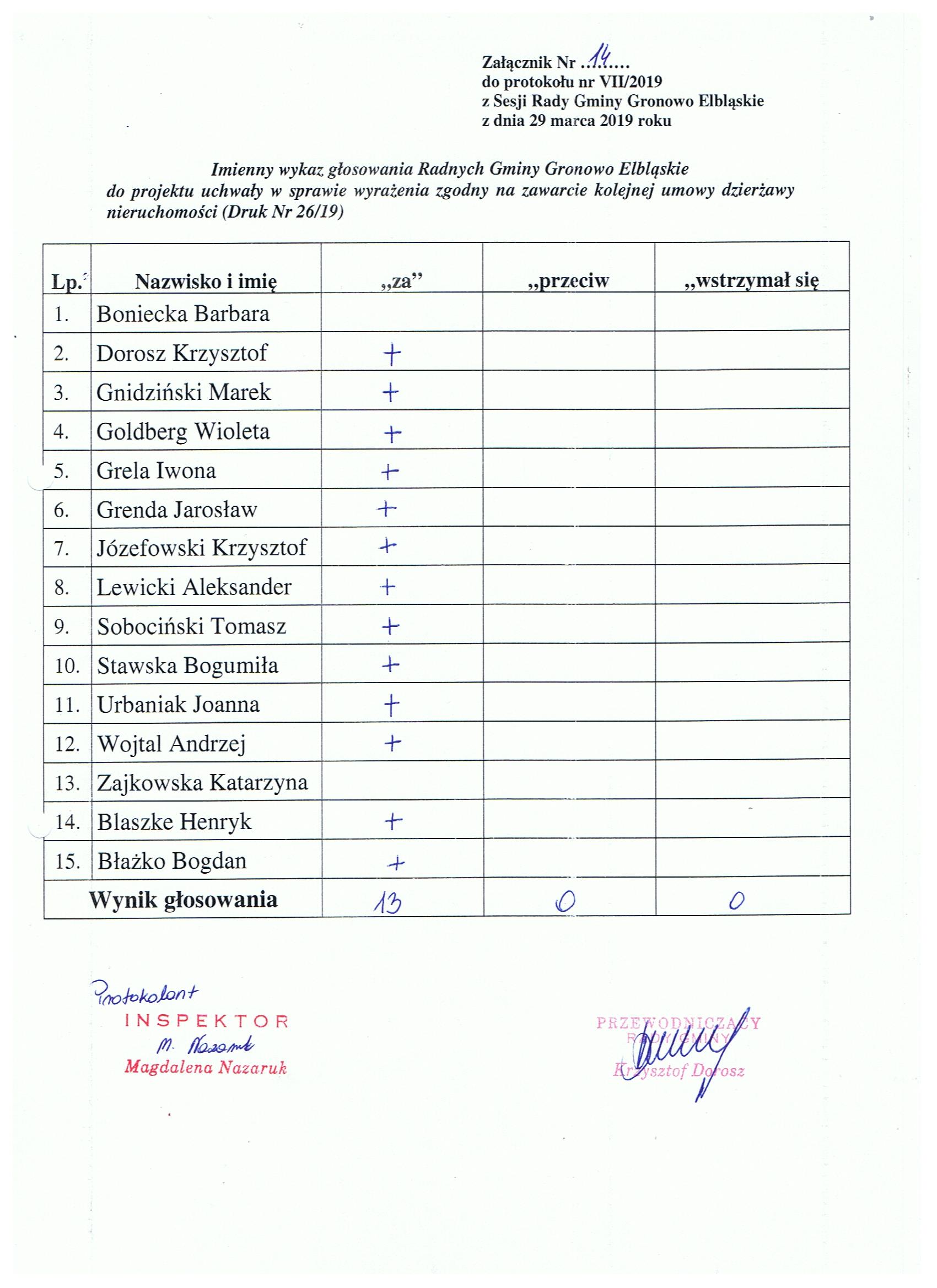 - pkt. 4 d - Głosowanie imienne do projektu uchwały w sprawie w sprawie wyrażenia zgodny na zawarcie kolejnej umowy dzierżawy nieruchomości