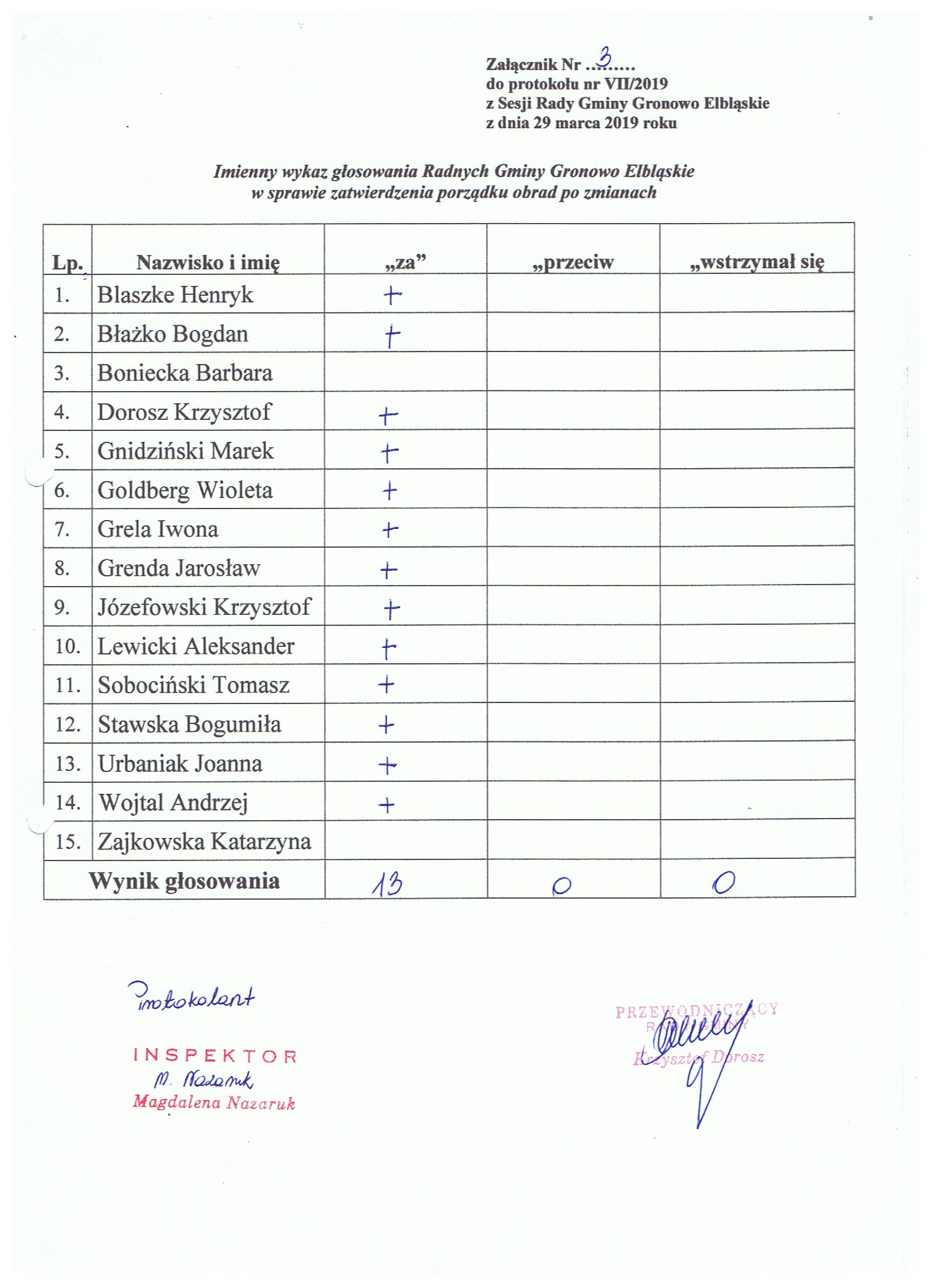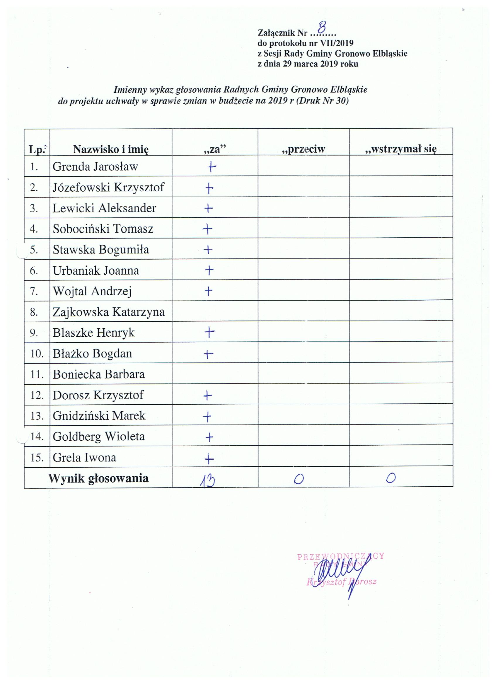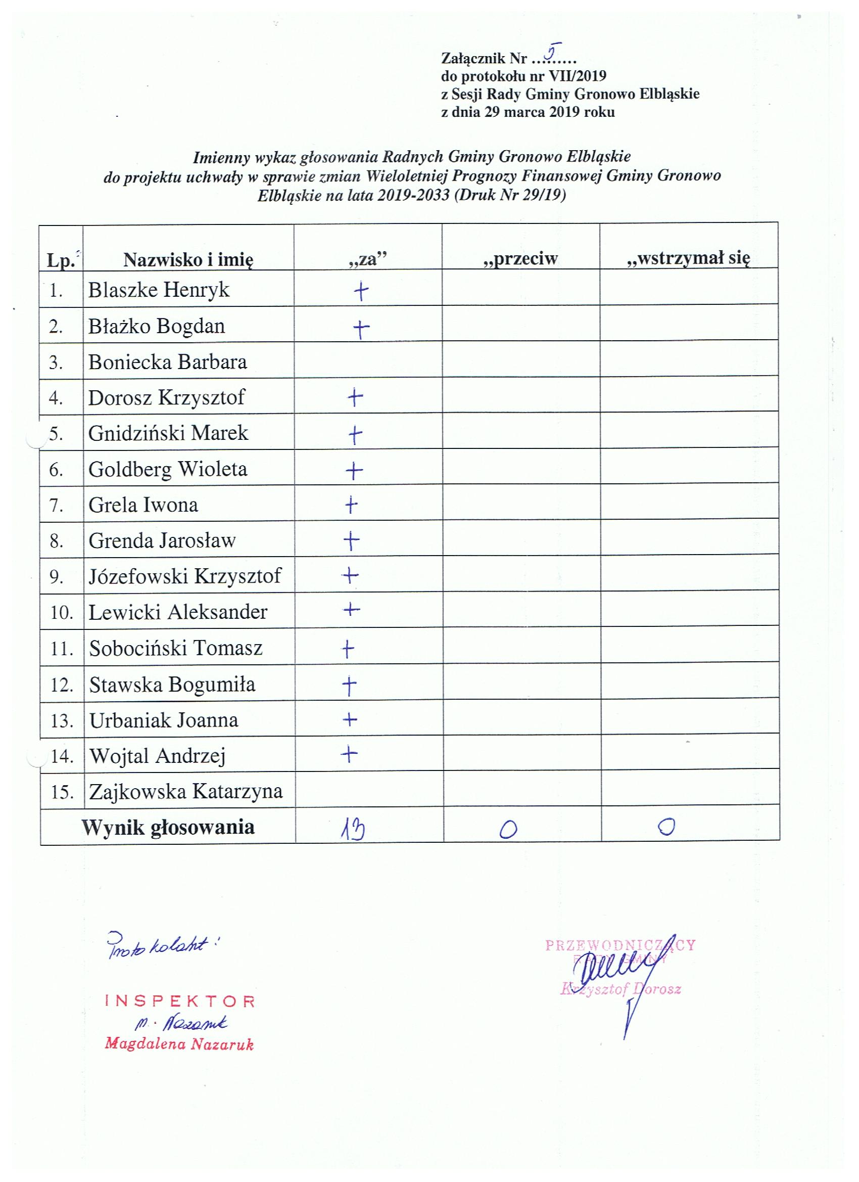 - pkt. 4 a - Głosowanie imienne do projektu uchwały w sprawie zmian Wieloletniej Prognozy Finansowej Gminy Gronowo Elbląskie na lata 2019-2033