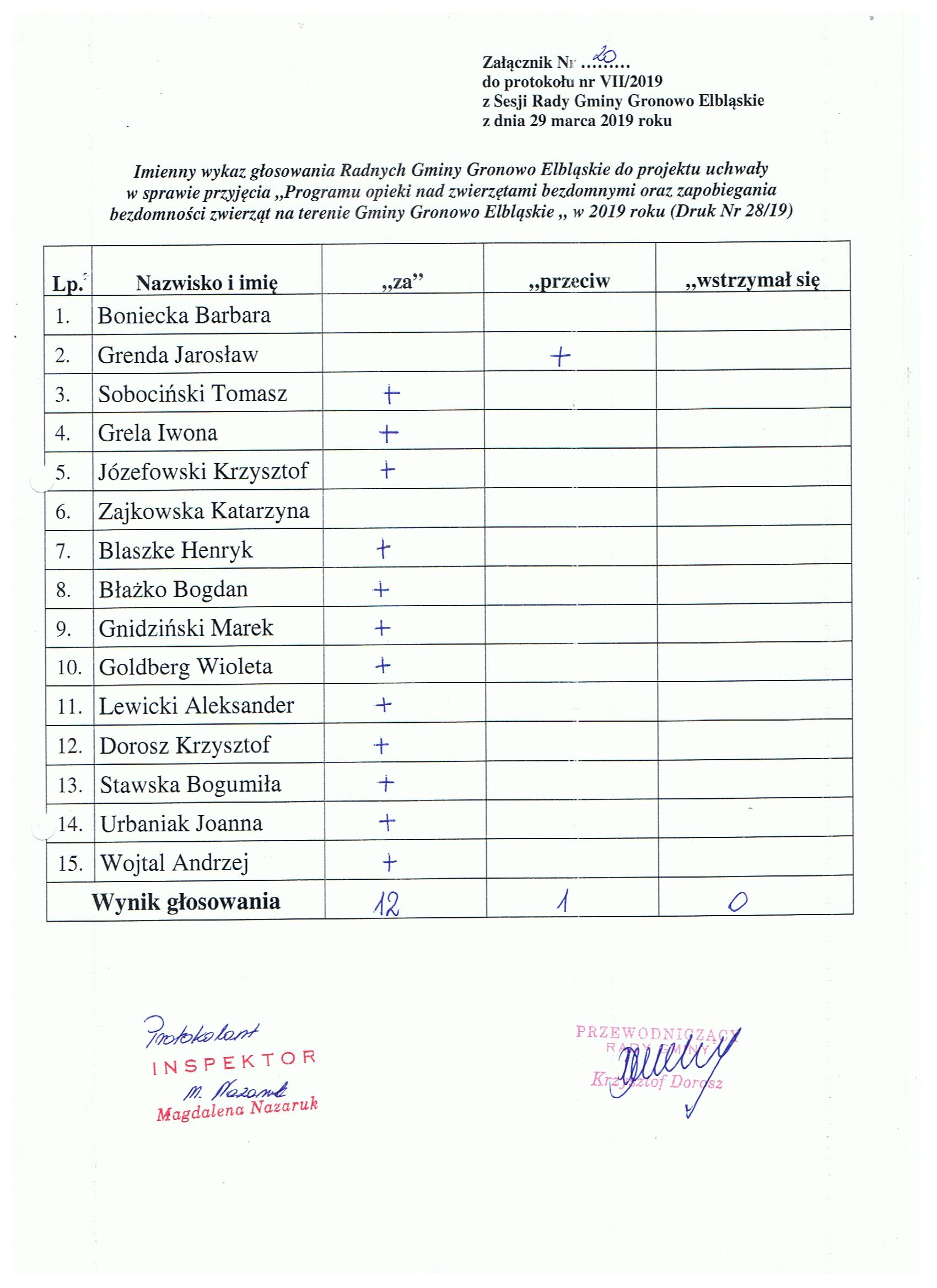 - pkt. 4 f - Głosowanie imienne do projektu uchwały w sprawie przyjęcia „Programu opieki nad zwierzętami bezdomnymi oraz zapobiegania bezdomności zwierząt na terenie Gminy Gronowo Elbląskie „ w 2019 roku