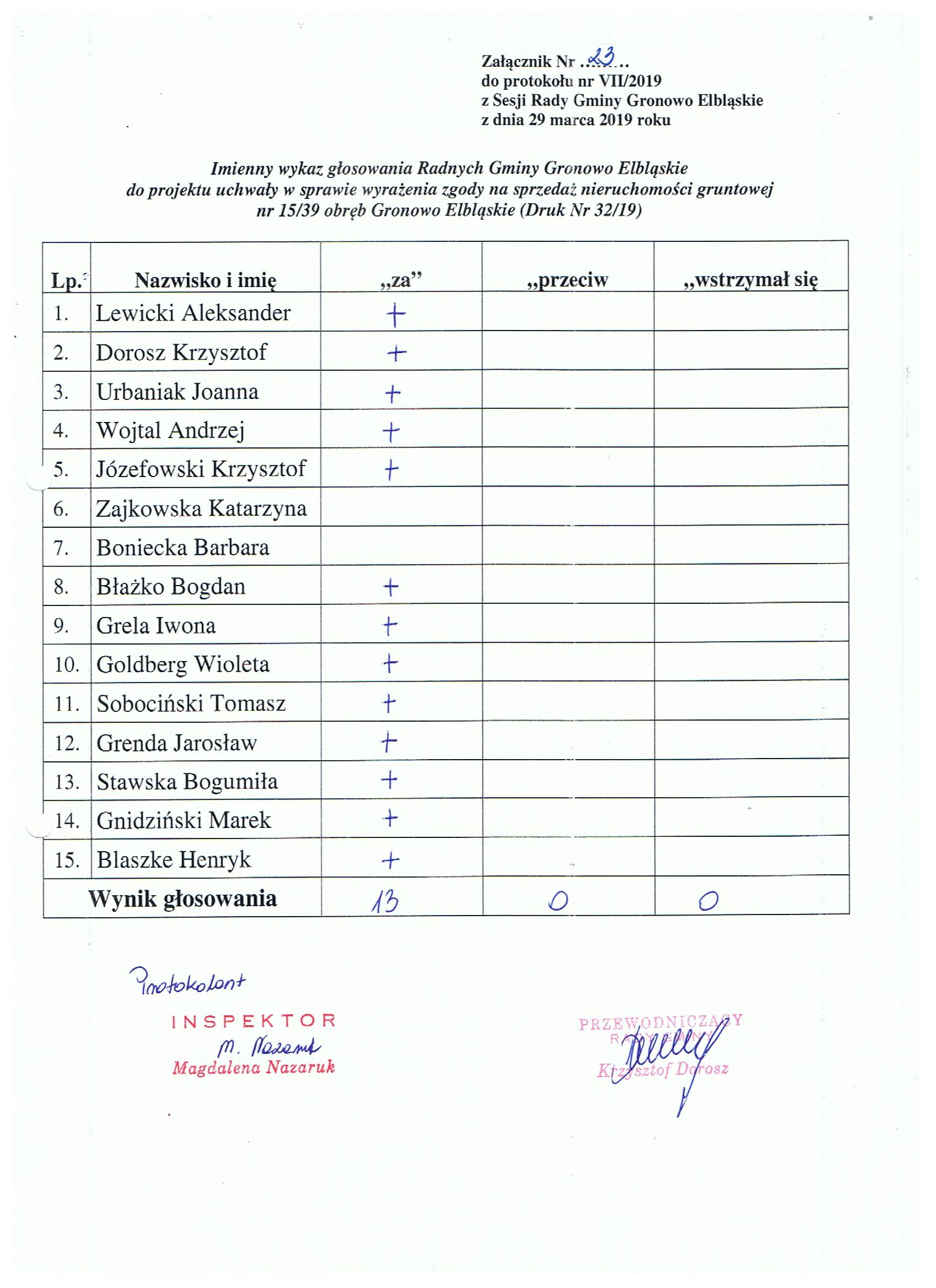 - pkt. 4 g - Głosowanie imienne do projektu uchwały w sprawie w sprawie wyrażenia zgody na sprzedaż nieruchomości gruntowej nr 15 39 obręb Gronowo Elbląskie
