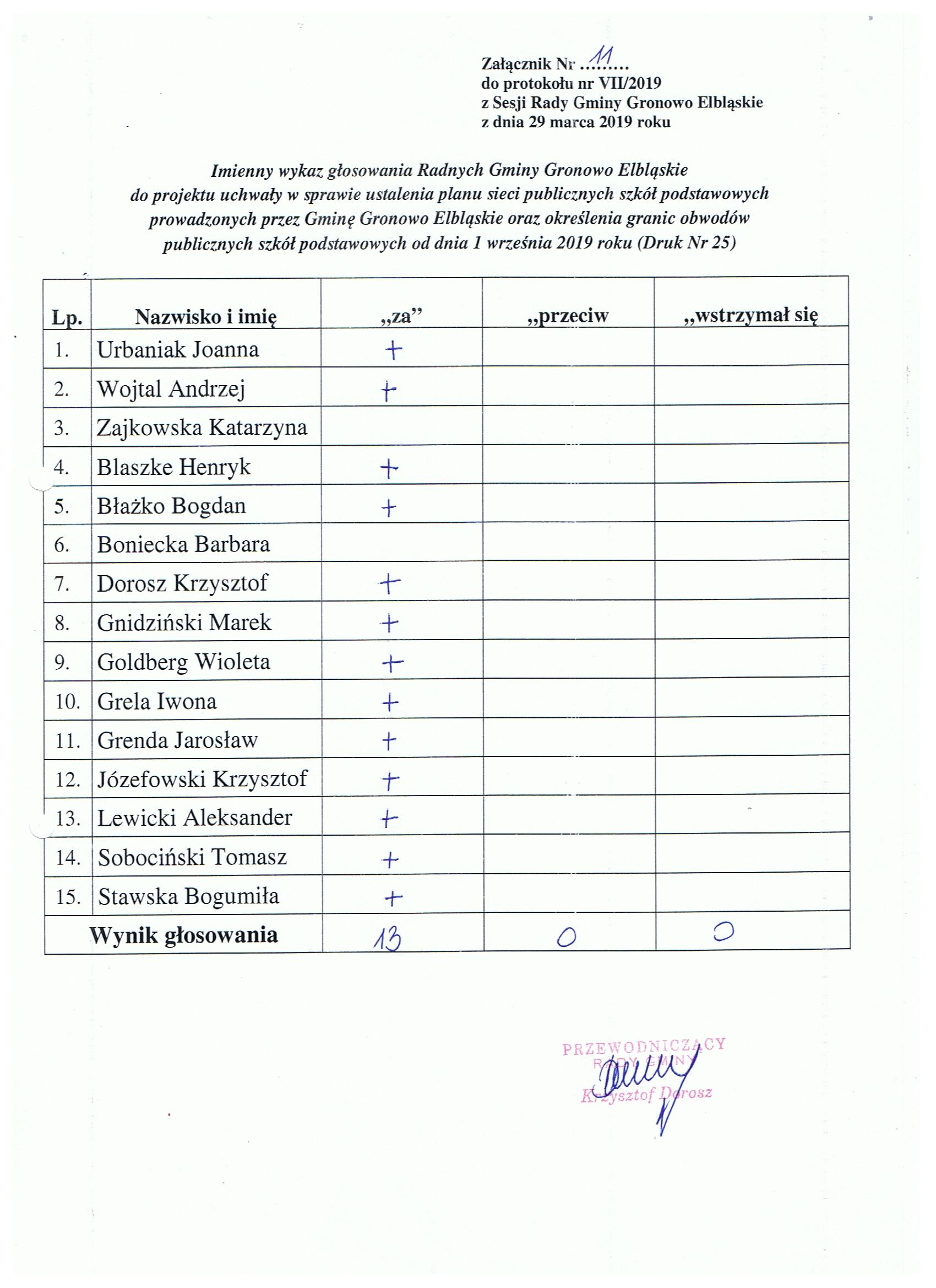 - pkt. 4 c - Głosowanie imienne do projektu uchwały w sprawie ustalenia planu sieci publicznych szkół podstawowych prowadzonych przez Gminę Gronowo Elbląskie oraz określenia granic obwodów publicznych szkół podstawowych od dnia 1 września 2019 roku