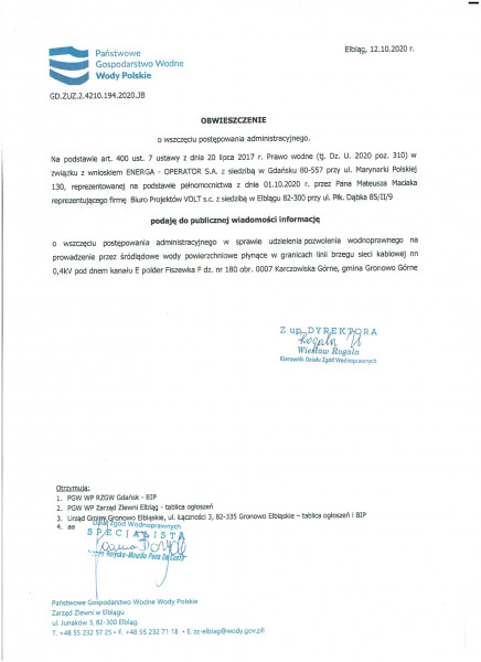 Wersja obowiązująca z dnia 15-10-2020 14:58:33 Drukuj Obwieszczecznie o wszczęciu postępowania administracyjnego