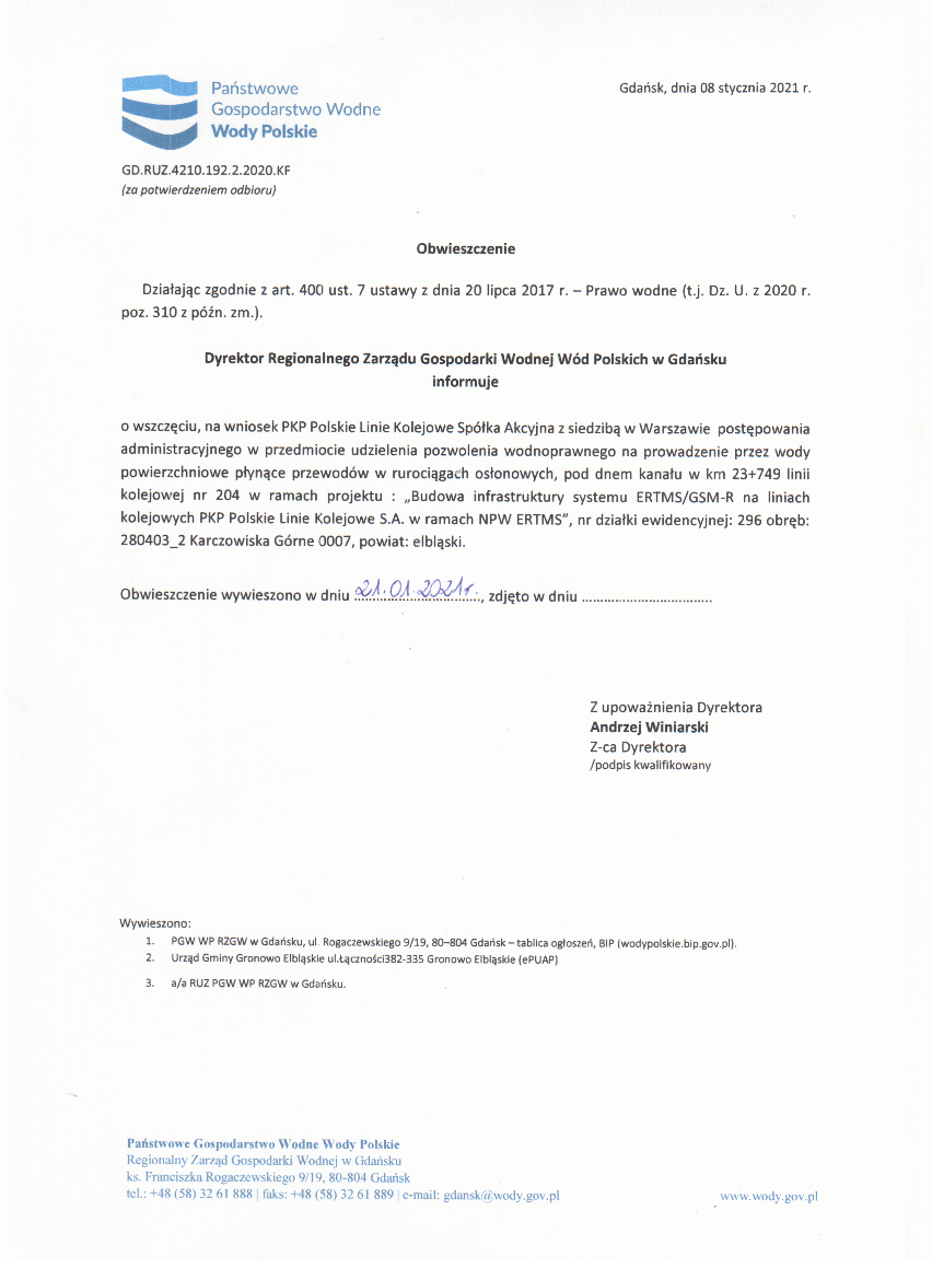 Postępowanie prowadzone przez Dyrektora Regionalnego Zarządu Gospodarki Wodnej Wód Polskich w Gdańsku w sprawie udzielenia pozwolenia wodnoprawnego w ramach projektu: "Budowa infrastruktury systemu ERTMS/GSM-R na liniach kolejowych PKP Polskie Linie Kolejowe S.A w ramach NPW ERTMS", nr działki 296 obręb Karczowiska Górne, gm. Gronowo Elbląskie