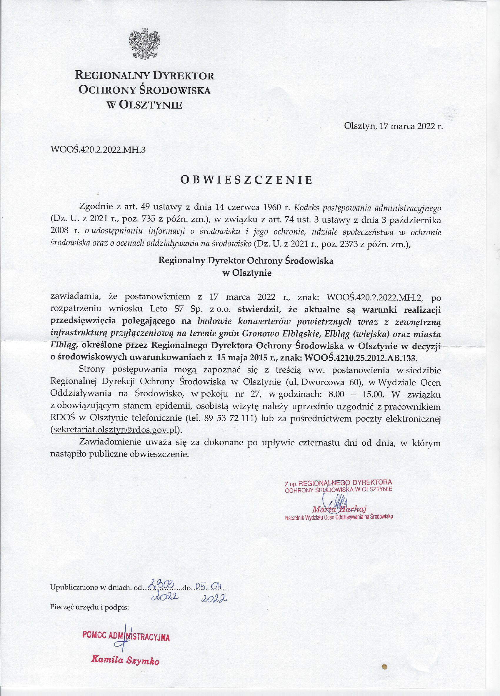 Wersja obowiązująca z dnia 23-03-2022 13:01:39 Drukuj Regionalny Dyrektor Ochrony Środowiska w Olsztynie Załączniki Skan_20220323 (2) format: image/png, rozmiar: 4.68 MB, data dodania: 23-03-2022 13:01:39