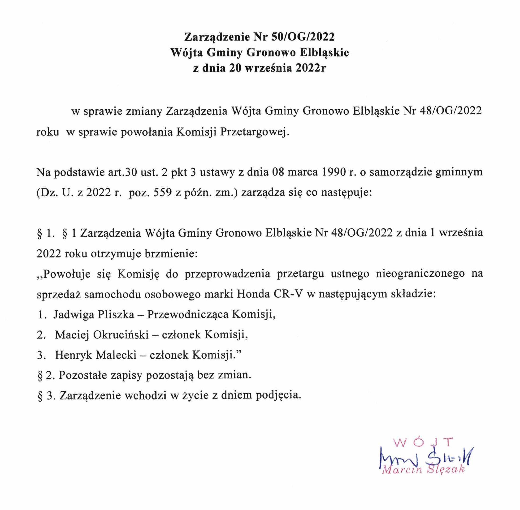 Zarządzenie Nr 50/OG/2022 Wójta Gminy Gronowo Elbląskie z dnia 20 września 2022r. w sprawie zmiany Zarządzenia Wójta Gminy Gronowo Elbląskie Nr 48/OG/2022 w sprawie powołania Komisji Przetargowej.