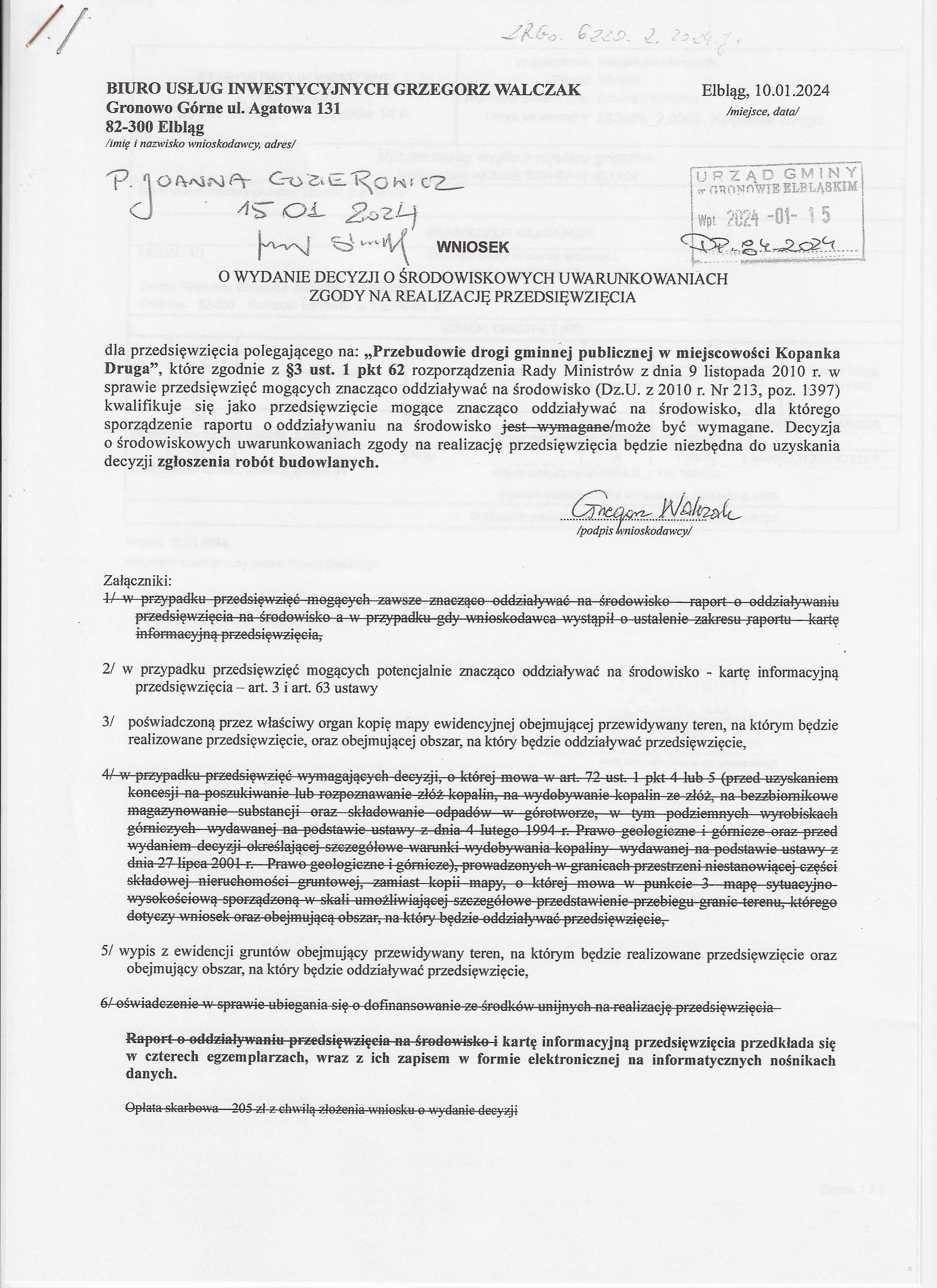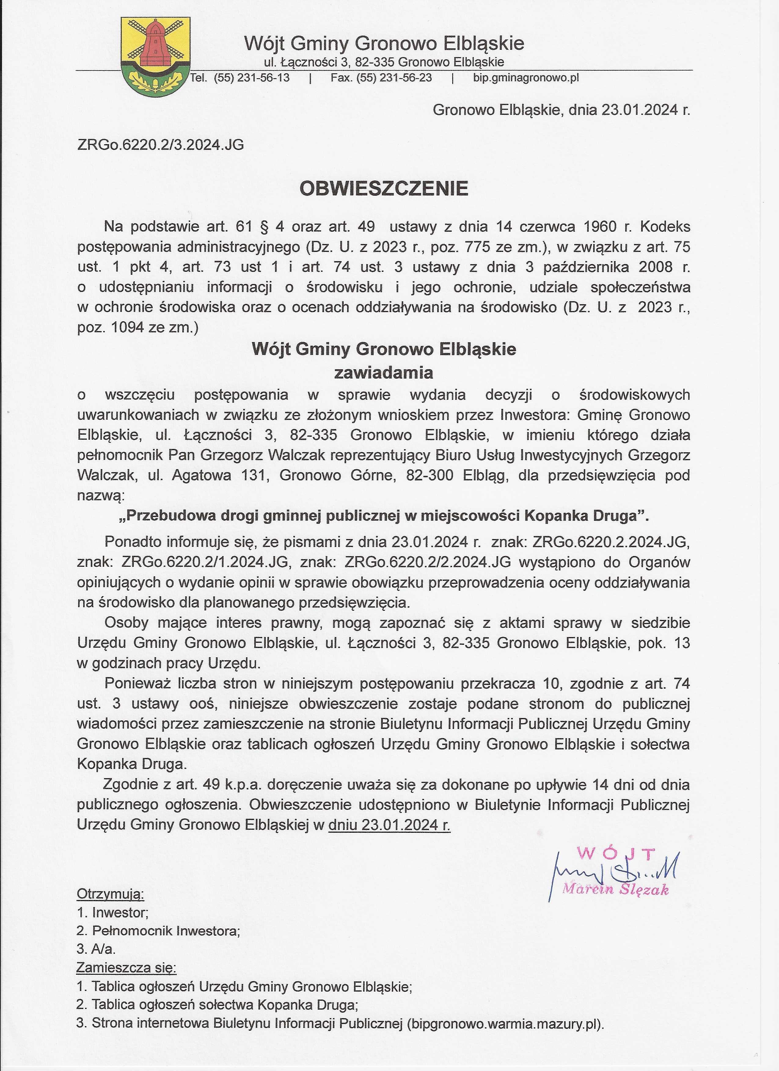 Postępowanie w sprawie wydania decyzji o środowiskowych uwarunkowaniach dla przedsięwzięcia pn. "Przebudowa drogi gminnej publicznej w miejscowości Kopanka Druga".