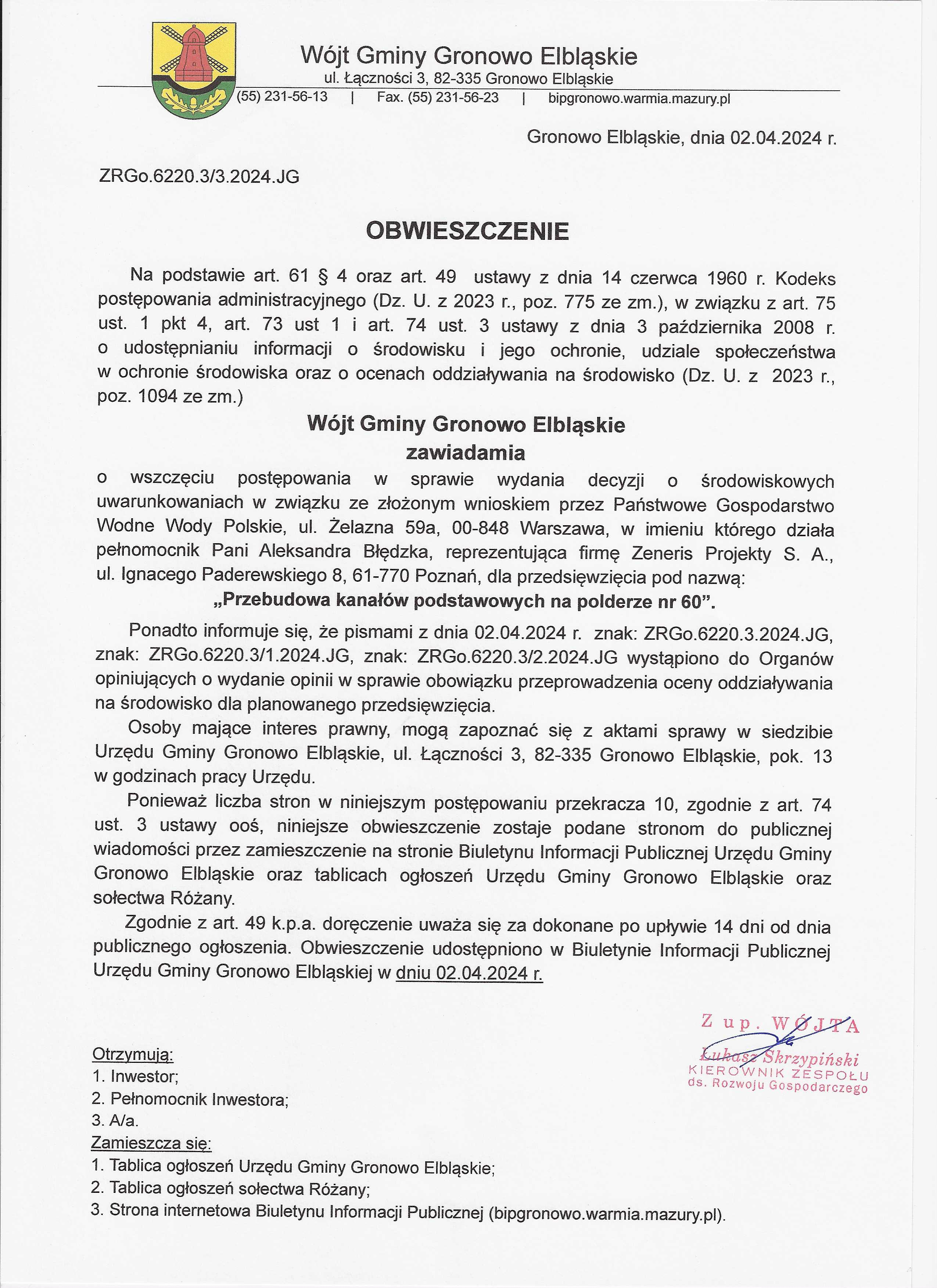 Postępowanie w sprawie wydania decyzji o środowiskowych uwarunkowaniach dla przedsięwzięcia pn. "Przebudowa kanałów podstawowych na polderze nr 60"