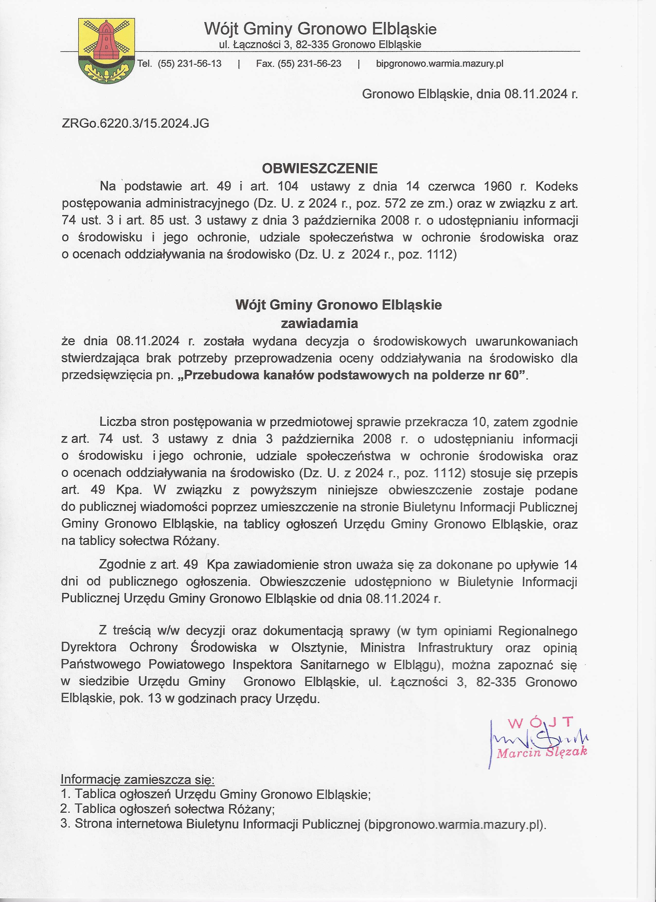 - Obwieszczenie o wydaniu decyzji o środowiskowych uwarunkowaniach dla przedsięwzięcia pn. Przebudowa kanałów podstawowych na polderze nr 60