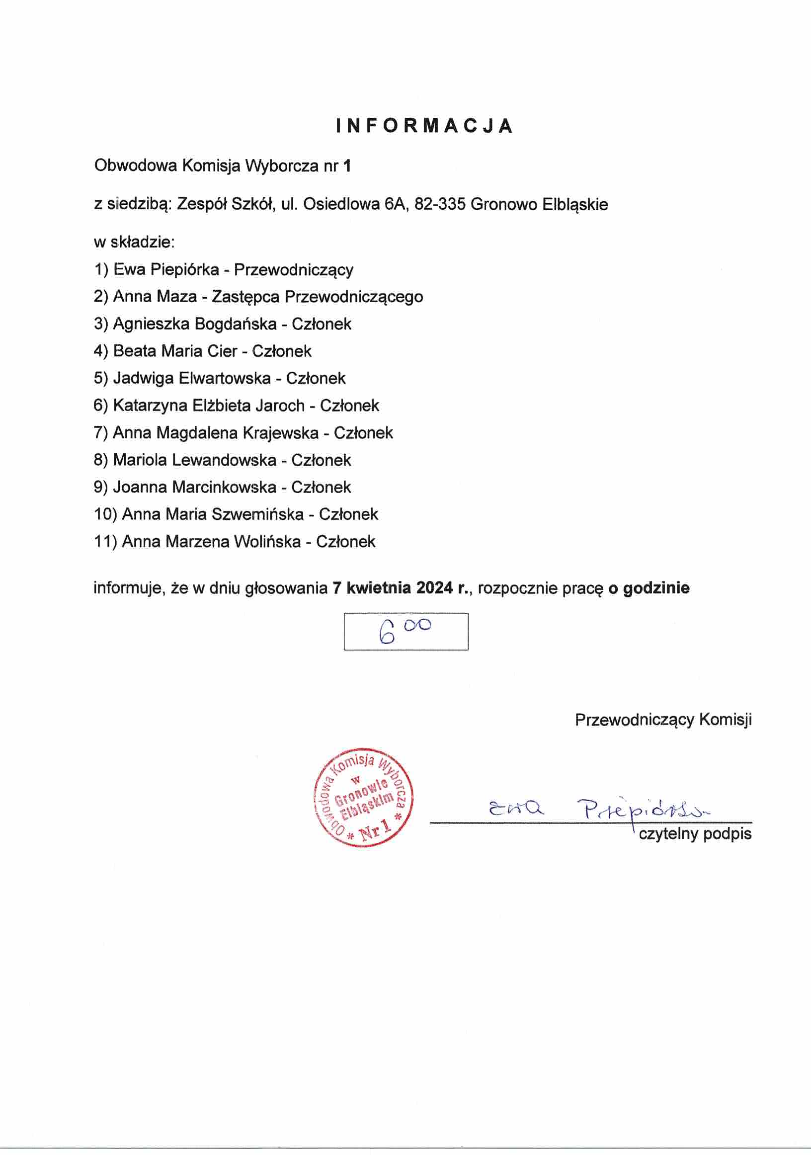 Wersja obowiązująca z dnia 05-04-2024 09:11:45 Drukuj Informacja obwodowa komisja wyborcza nr 1 o rozpoczeciu pracy w dniu 7 kwietnia 2024 Załączniki komisja 1 format: image/png, rozmiar: 621.45 KB, data dodania: 05-04-2024 09:11:45