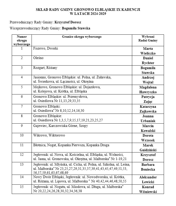 Wersja obowiązująca z dnia 08-05-2024 13:43:33 Drukuj SKŁAD RADY GMINY GRONOWO ELBLĄSKIE IX KADENCJI W LATACH 2024-2029 Załączniki sklad rady format: image/png, rozmiar: 69.29 KB, data dodania: 08-05-2024 13:43:33