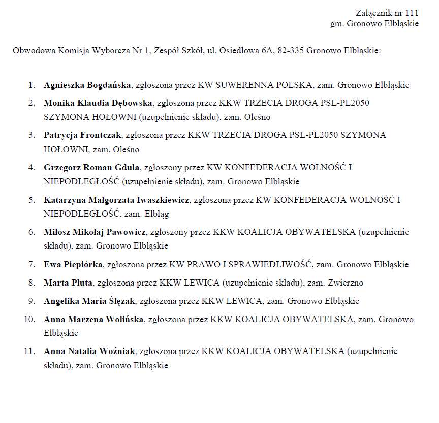 W celu przeprowadzenia wyborów do Parlamentu Europejskiego zarządzonych na dzień 9 czerwca 2024 r., powołuje się obwodowe komisje wyborcze, w gminach na obszarze powiatu bartoszyckiego, powiatu braniewskiego, powiatu elbląskiego, powiatu lidzbarskiego, w mieście na prawach powiatu Elblągu, w skład których wchodzą osoby wymienione w załącznikach nr 1 – 259 do postanowienia.