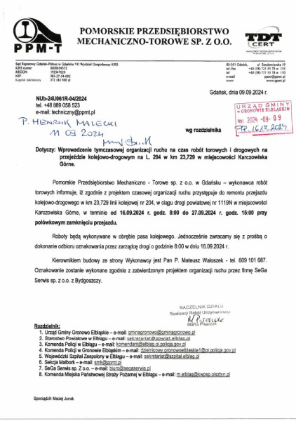 Wersja obowiązująca z dnia 12-09-2024 11:57:42 Drukuj Tymczasowa organizacja ruchu na czas robót torowych ... Załączniki Skan_20240912 (2) format: pdf, rozmiar: 400.51 KB, data dodania: 12-09-2024 11:57:42