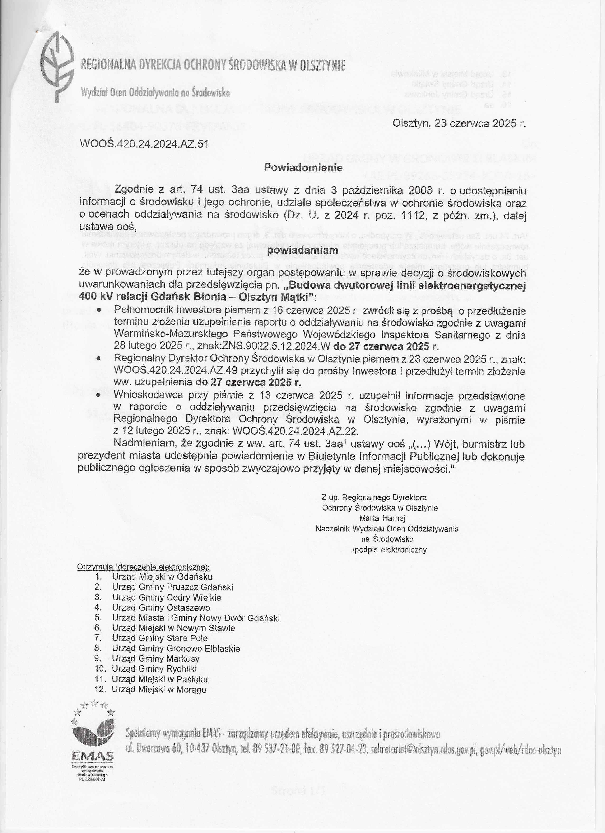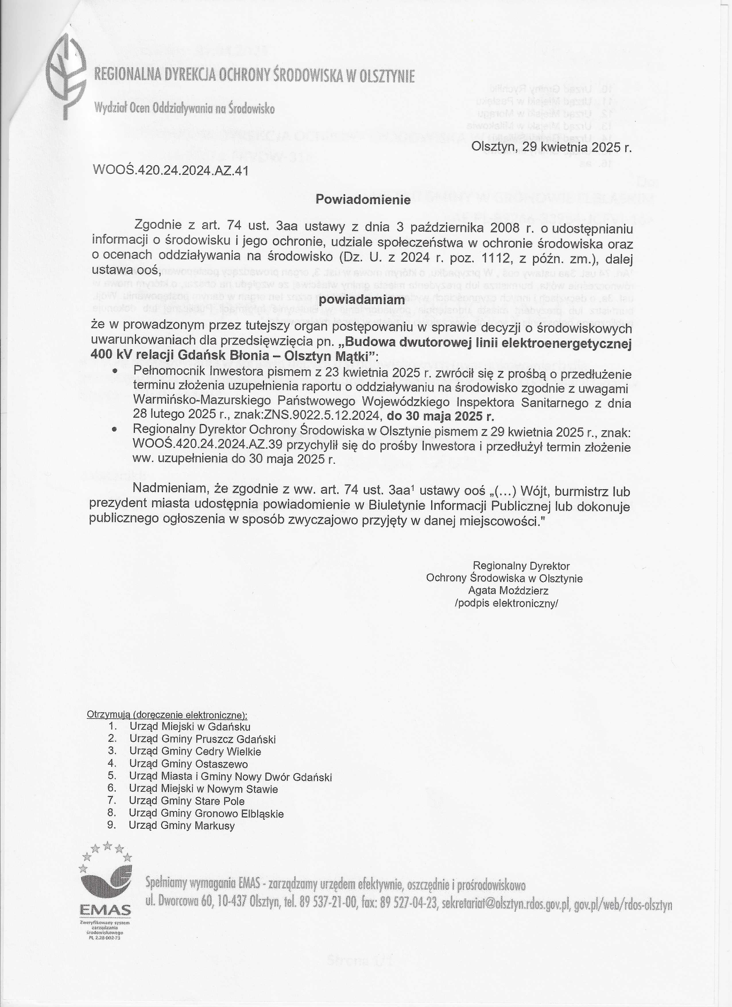 - powiadomienie RDOŚ znak: WOOŚ.420.24.2024.AZ.35 z dnia 10.04.2025 r. o przedłużeniu terminu załatwienia sprawy