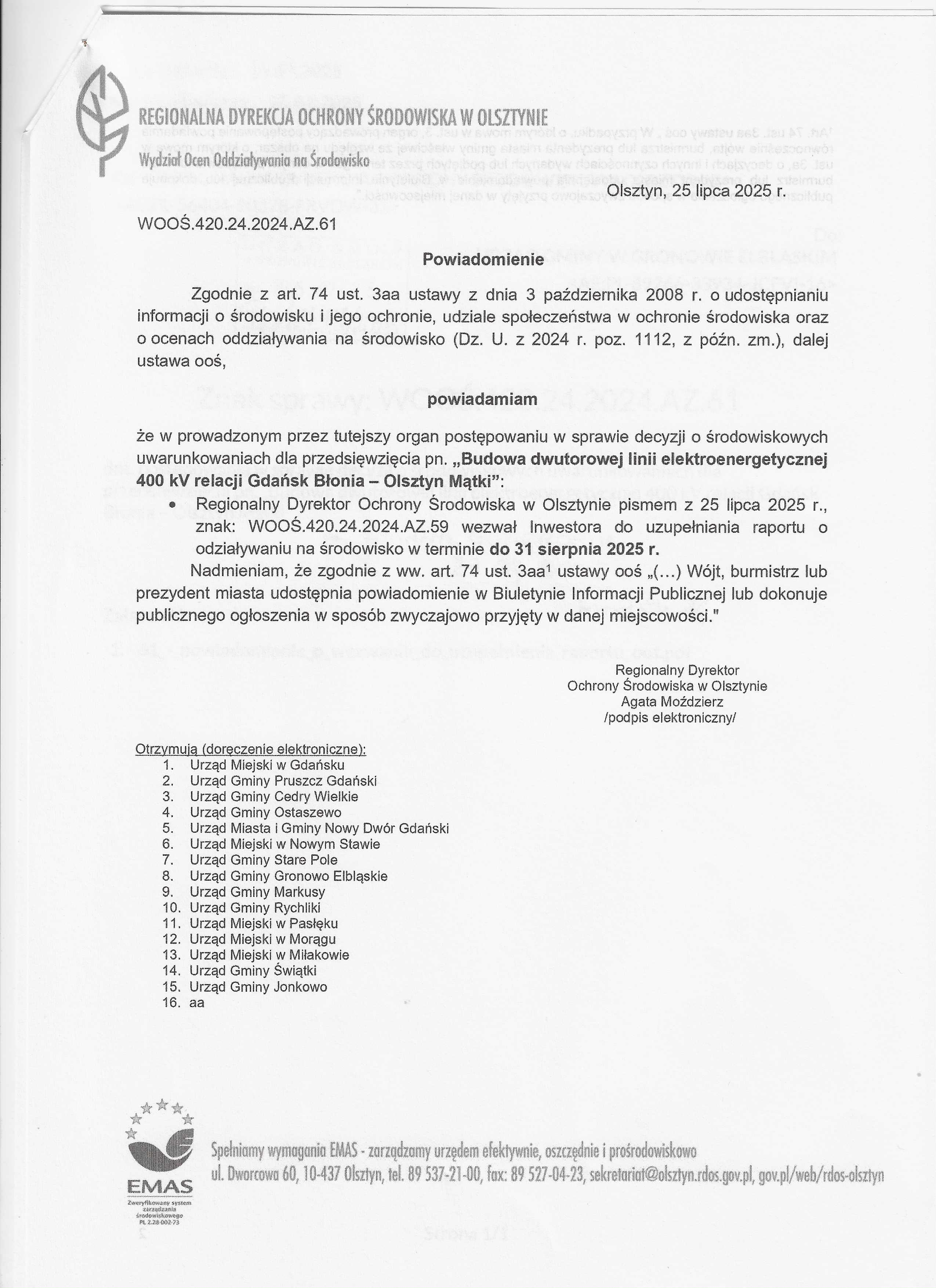 - Powiadomienie RDOŚ znak: WOOŚ.420.24.2024.AZ.61 z dnia 25.07.2025 r.