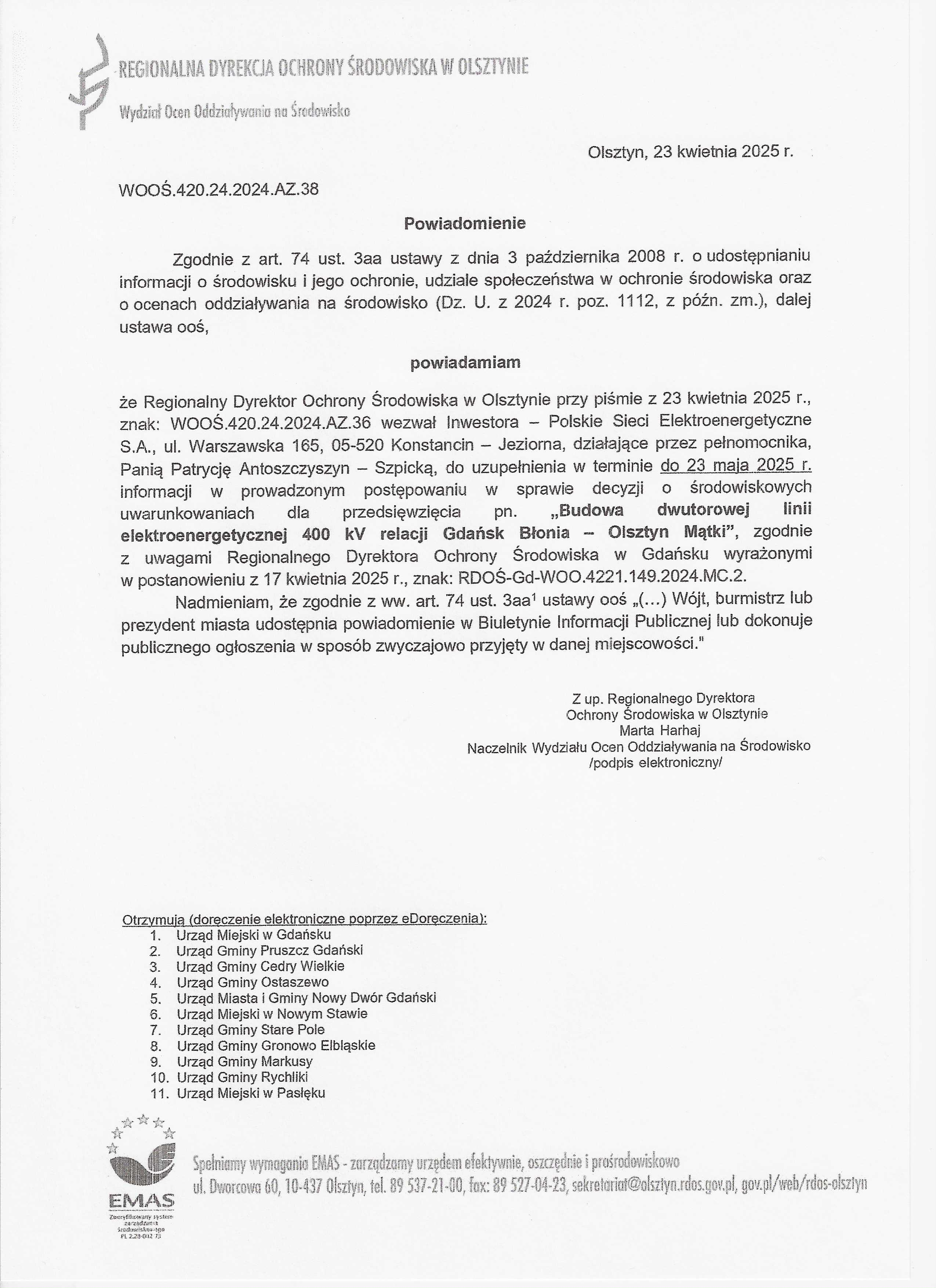 Powiadomienie Regionalnego Dyrektora Ochrony Środowiska w Olsztynie znak: WOOŚ.420.24.2024.AZ.38 z dnia 23.04.2025 r. dotyczące wezwania Inwestora do złożenia wyjaśnień dla przedsięwzięcia pn. "Budowa dwutorowej linii elektroenergetycznej 400 kV relacji Gdańsk Błonia- Olsztyn Mątki".