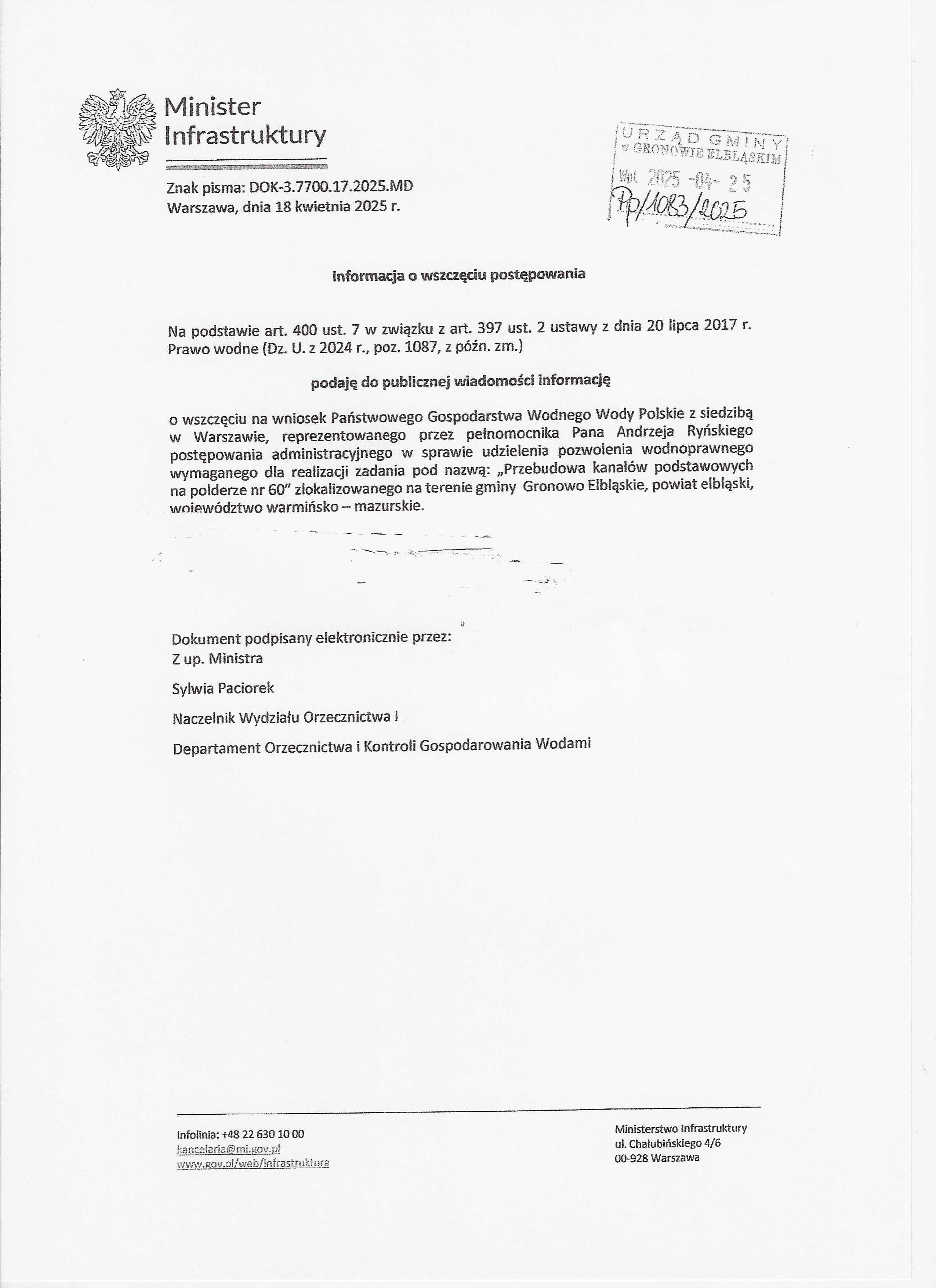 Informacja Ministra Infrastruktury znak: DOK-3.7700.17.2025.MD z dnia 18.04.2025 r. o wszczęciu postępowania na wniosek Państwowego Gospodarstwa Wodnego Wody Polskie z siedzibą w Warszawie w sprawie udzielenia pozwolenia wodnoprawnego do zadania pod nazwą: "Przebudowa kanałów podstawowych na polderze nr 60" zlokalizowanego na terenie gminy Gronowo Elbląskie, powiat elbląski, województwo warmińsko- mazurskie