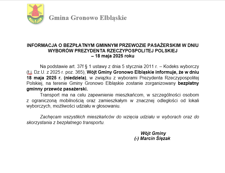 INFORMACJA O BEZPŁATNYM GMINNYM PRZEWOZIE PASAŻERSKIM W DNIU WYBORÓW PREZYDENTA RZECZYPOSPOLITEJ POLSKIEJ – 18 maja 2025 roku