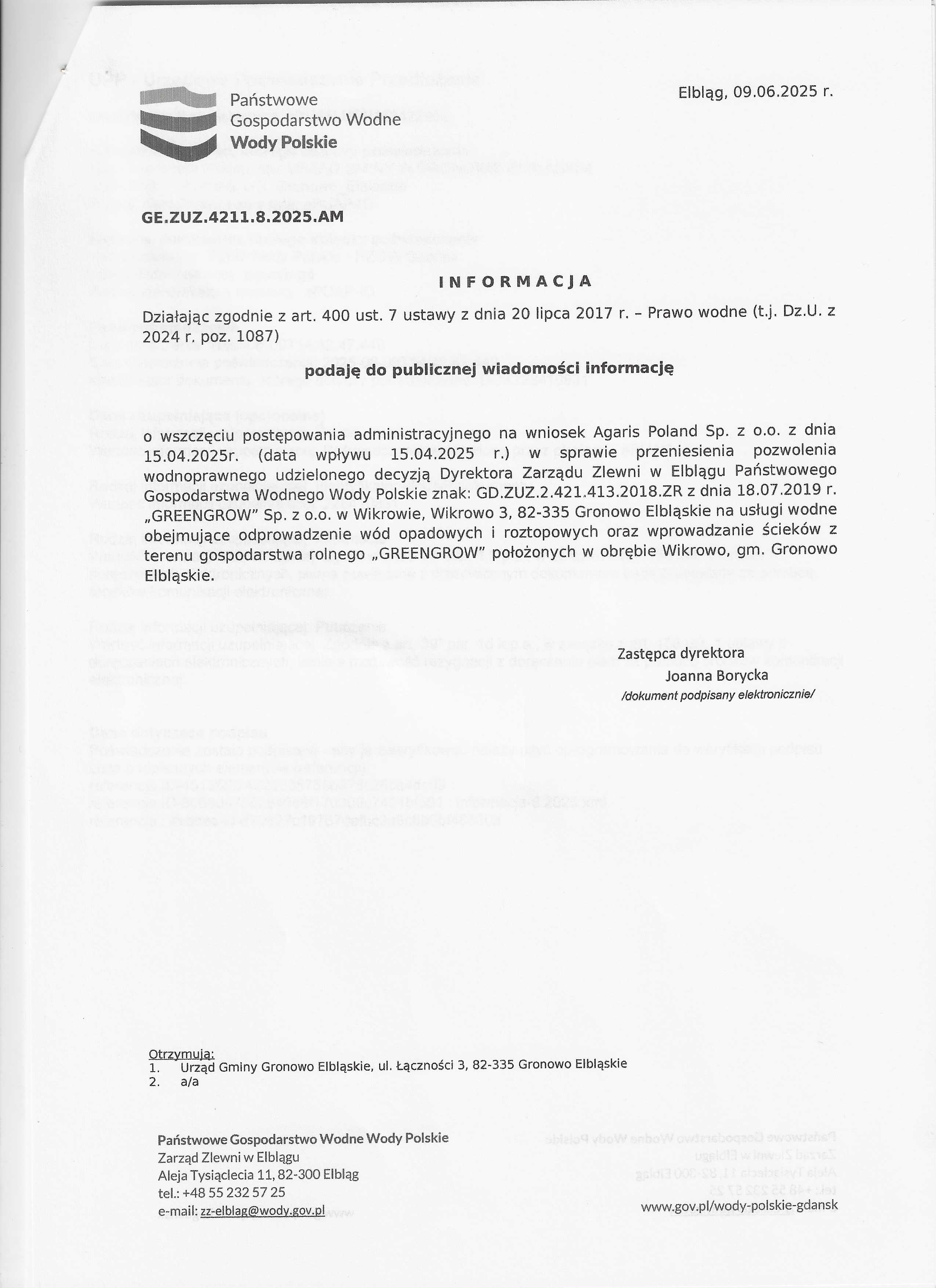 Informacja Dyrektora Państwowego Gospodarstwa Wodnego Wody Polskie znak: GE.ZUZ.4211.8.2025.AM z dnia 09.06.2025 r. o wszczęciu postępowania na wniosek Agaris Poland Sp. z o.o. w sprawie przeniesienia pozwolenia wodnoprawnego udzielonego decyzją Dyrektora Zarządu Zlewni w Elblągu Państwowego Gospodarstwa Wodnego Wody Polskie znak: GD.ZUZ.421.413.2018.ZR z dnia 18.07.2019 r. "GREENGROW" Sp. z o.o. w Wikrowie, Wikrowo 3, 82-335 Gronowo Elbląskie na usługi wodne obejmujące odprowadzenie wód opadowych i roztopowych oraz wprowadzanie ścieków z terenu gospodarstwa rolnego "GREENGROW".