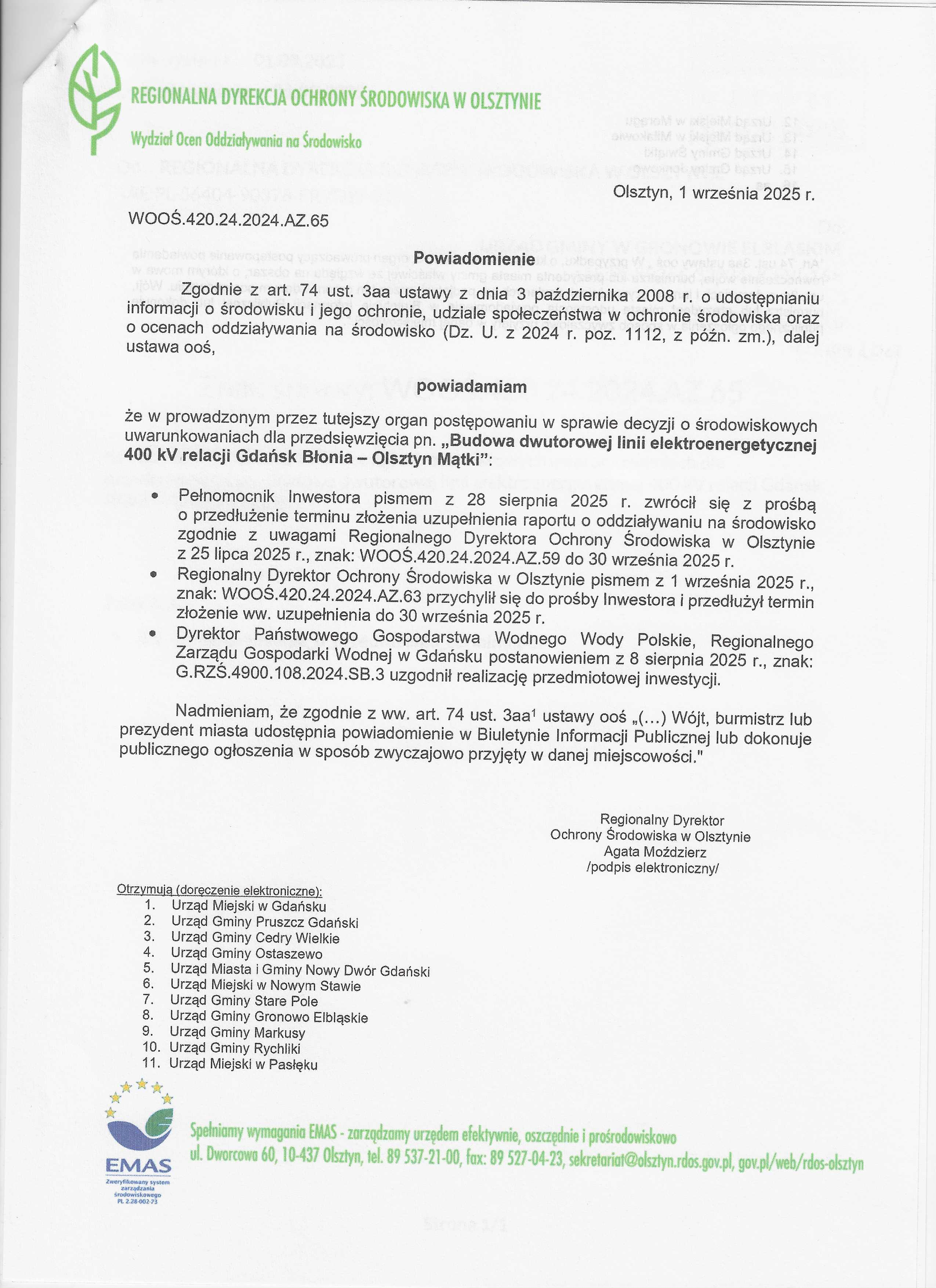 Powiadomienie RDOŚ w Olsztynie znak: WOOŚ.420.24.2024.AZ.65 z dnia 01.09.2025 r. dotyczące przdłużenia terminu złożenia uzupełnienia raportu o oddziaływaniu na środowisko dla przedsięwzięcia pn. "Budowa dwutorowej linii elektroenergetycznej 400 kV relacji Gdańsk Błonia- Olsztyn Mątki".
