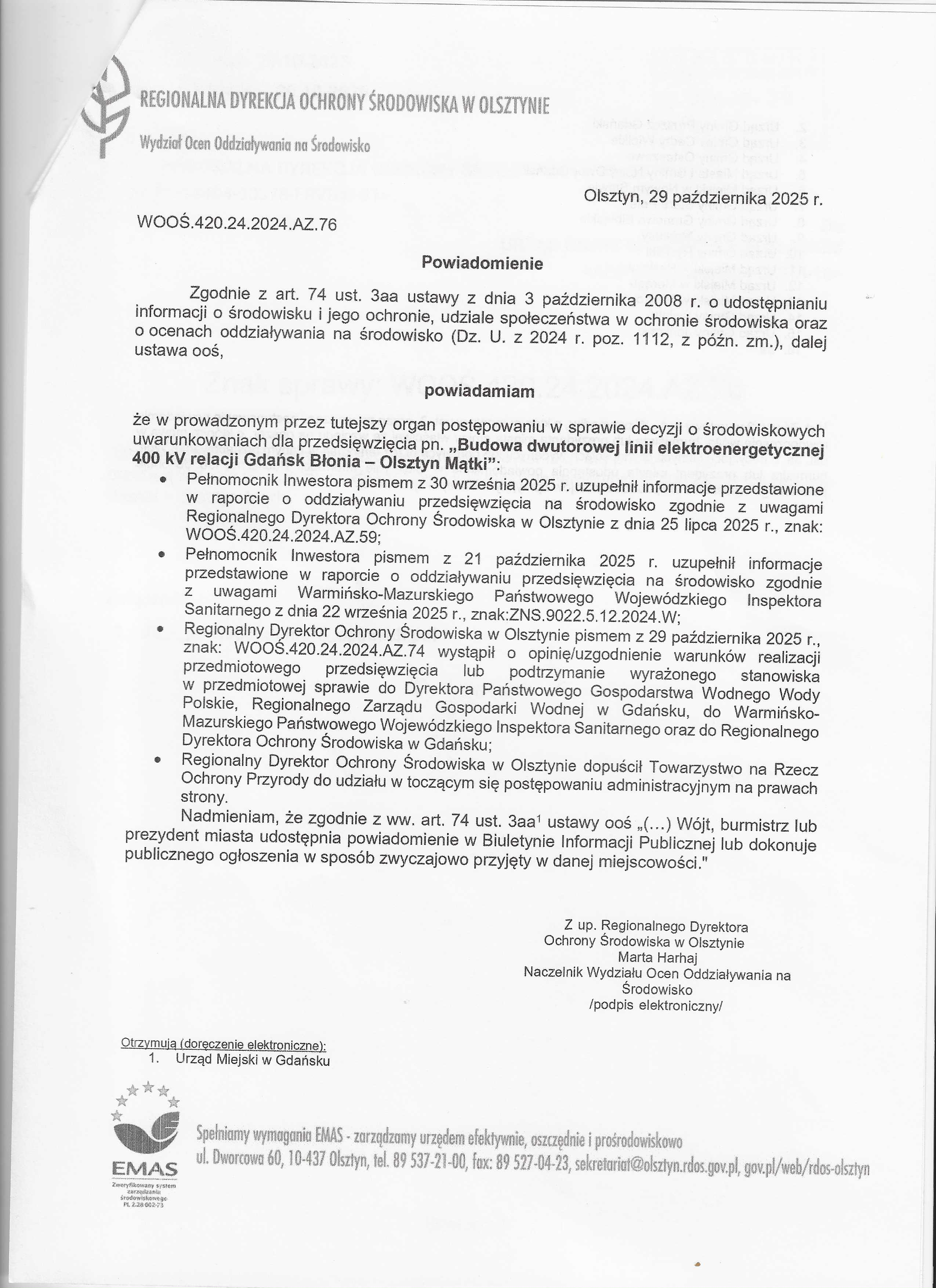 Powiadomienie RDOŚ w Olsztynie znak: WOOŚ.24.2024.AZ.76 z dnia 29.10.2025 r. dotyczące postępowania w przedmiocie wydania decyzji o środowiskowych uwarunkowaniach dla przedsięwzięcia pn.: "Budowa dwutorowej linii elektroenergetycznej 400 kV relacji Gdańsk Błonia- Olsztyn Mątki".