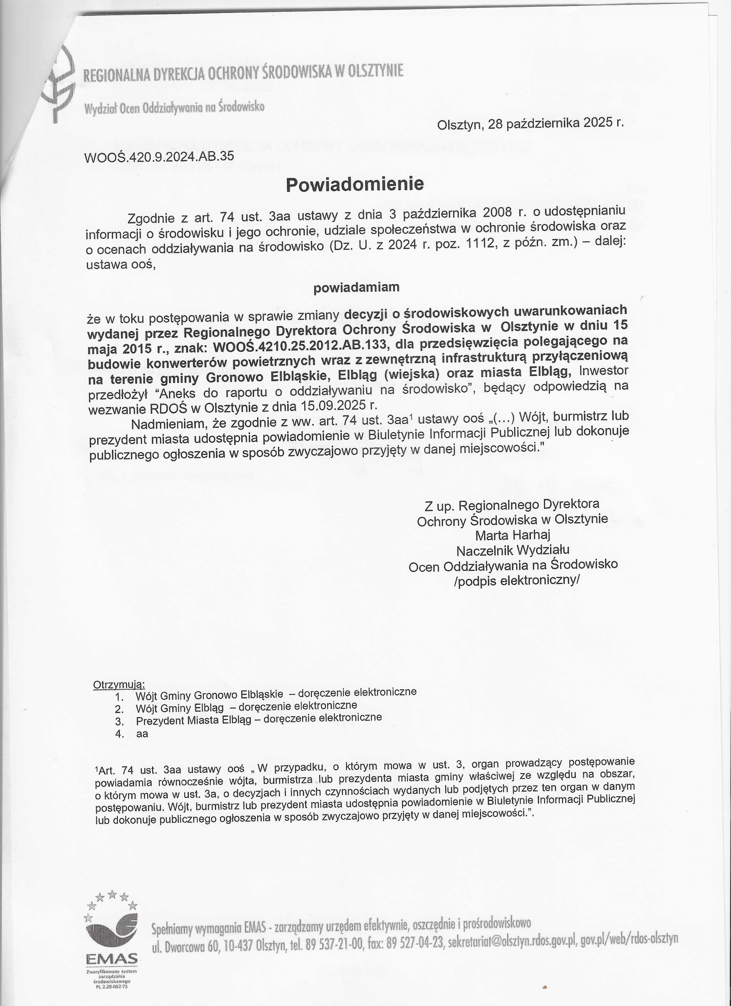 Powiadomienie RDOŚ w Olsztynie znak: WOOŚ.9.2024.AB.35 z dnia 28.10.2025 r. dotyczące postępowania w sprawie wydania decyzji o środowiskowych uwarunkowaniach dla zmiany decyzji o środowiwkowych uwarunkowaniach z dnia 15 maja 2015 r., znak: WOOŚ.4210.25.2012.AB.133 dla przedsięwzięcia poelgajacego na budowie konwerterów powietrznych wraz z zewnętrzną infrastrukturą przyłączeniową na terenie gminy Gronowo Elbląskie, Elbląg oraz miasta Elbląg