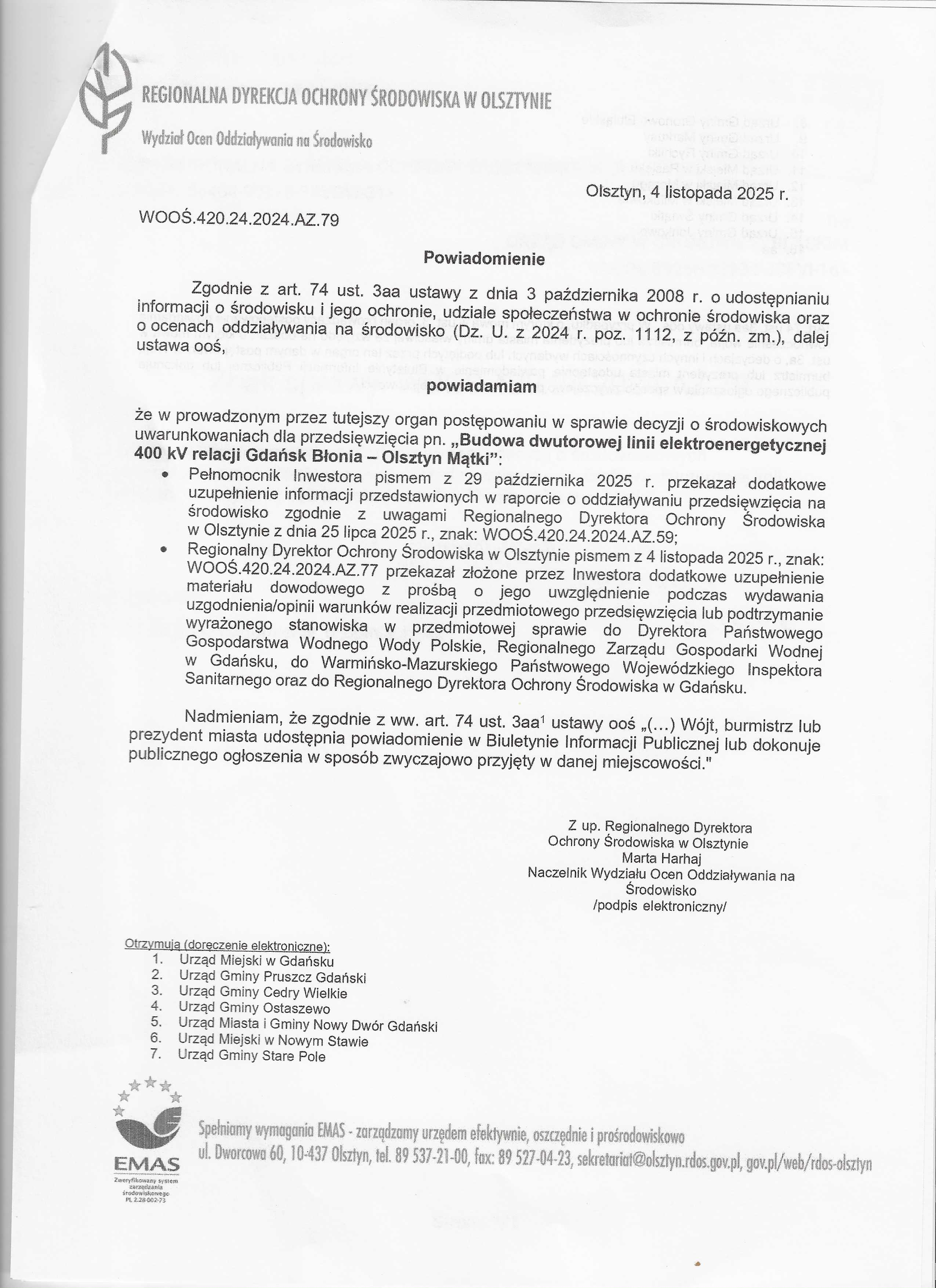 Wersja obowiązująca z dnia 06-11-2025 11:59:21 Drukuj Powiadomienie RDOŚ w Olsztynie znak: WOOŚ.420.24.2024.AZ.79 z dnia 04.11.2025 r. Załączniki Powiadomienie RDOŚ znak: WOOŚ.420.24.2024.AZ.79 z dnia 4 listopada 2025 r. dotyczące Budowy dwutorowej linii elektroenergetycznej 400 kV relacji Gdańsk Błonia- Olsztyn Mątki format: image/png, rozmiar: 3.58 MB, data dodania: 06-11-2025 11:59:21