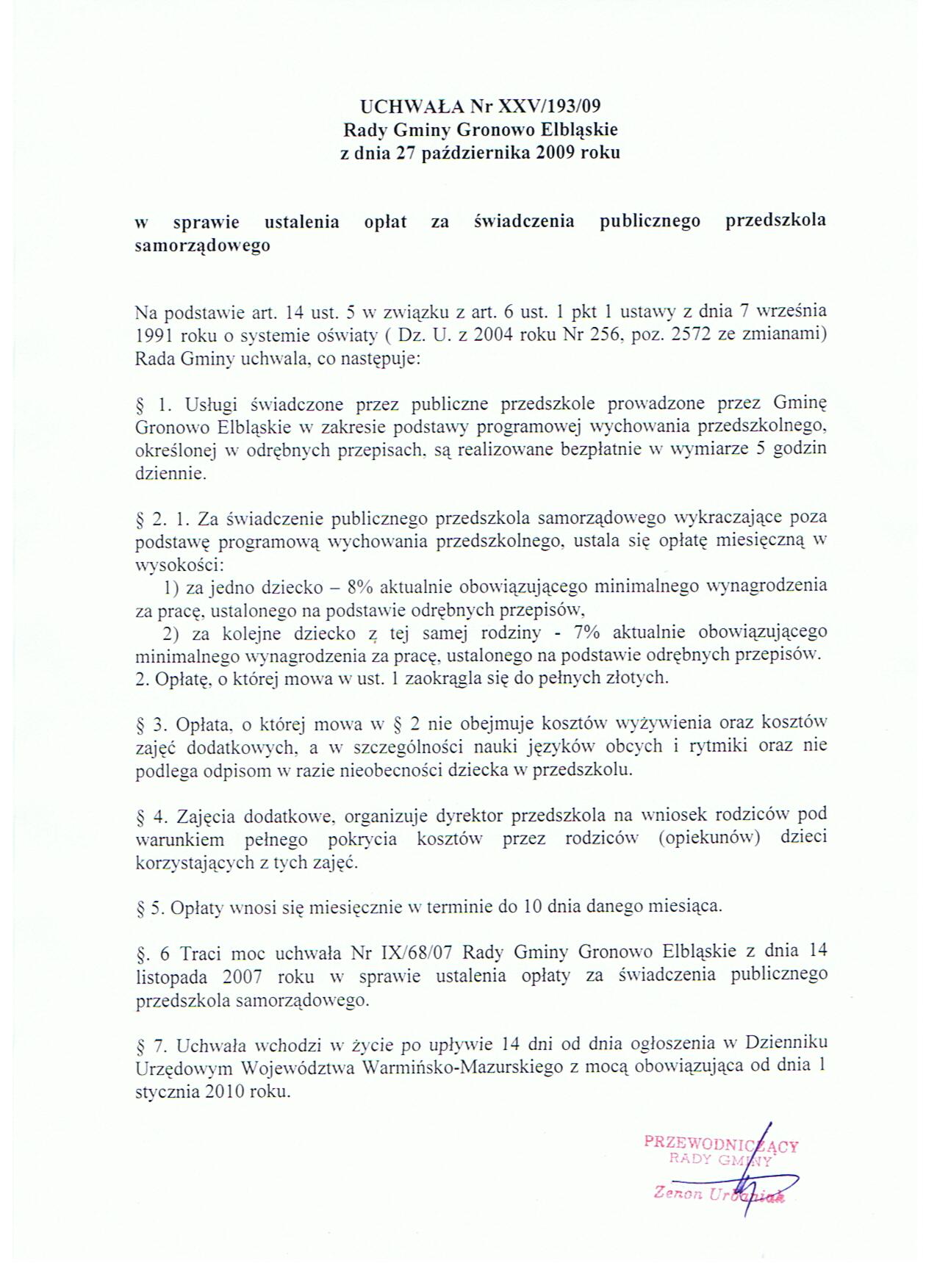 W sprawie ustalenia opłat za świadczenia publicznego przedszkola samorządowego