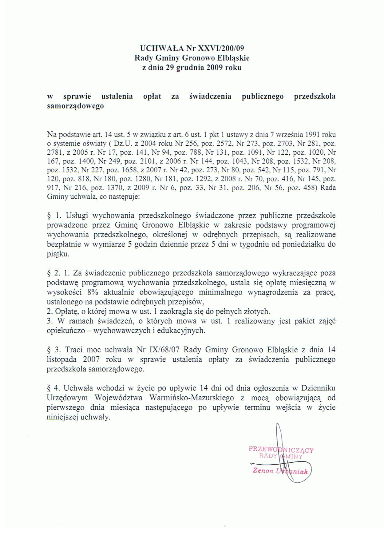 W sprawie ustalenia opłat za świadczenia publicznego przedszkola samorządowego