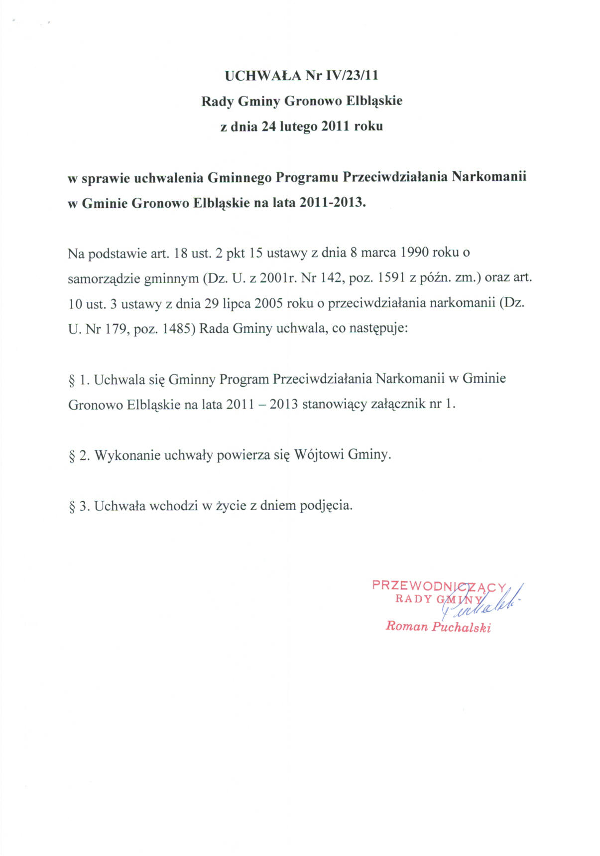 W sprawie uchwalenia Gminnego Programu Przeciwdziałania Narkomanii w Gminie Gronowo Elbląskie na lata 2011-2013