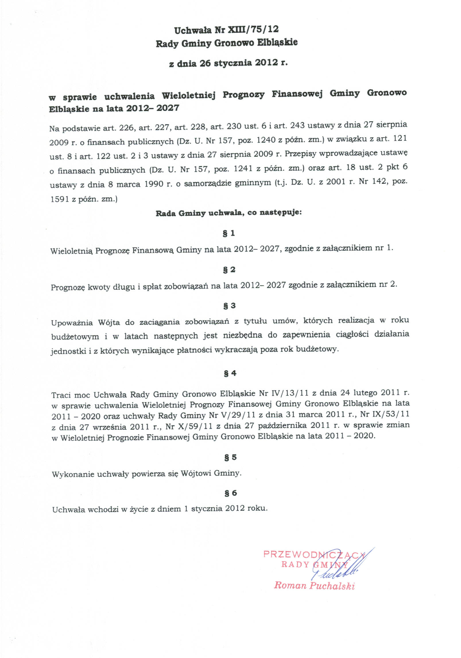 W sprawie uchwalenia Wieloletniej Prognozy Finansowej Gminy Gronowo Elbląskie na lata 2012-2027