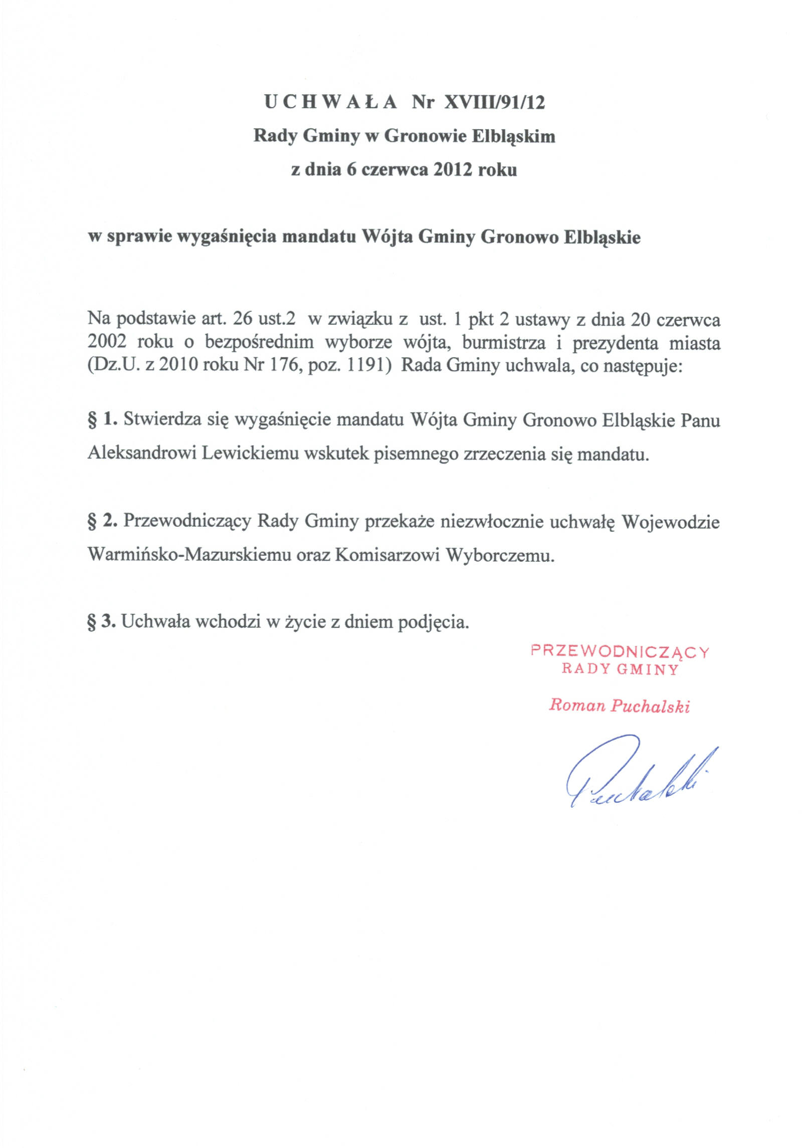 W sprawie wygaśnięcia mandatu Wójta Gminy Gronowo Elbląskie