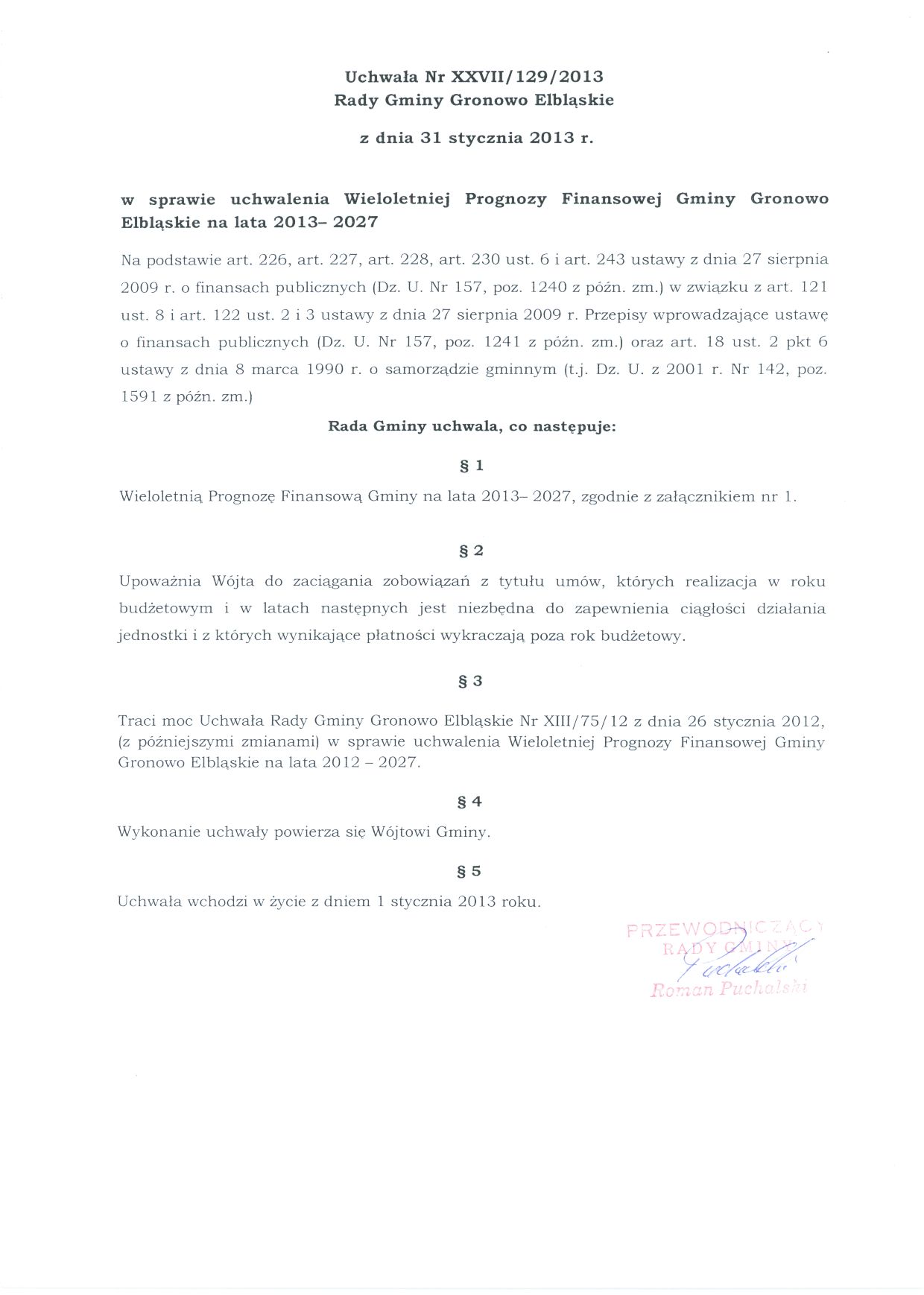 w sprawie Wieloletniej Prognozy Finansowej Gminy Gronowo Elbląskie na lata 2013 - 2027