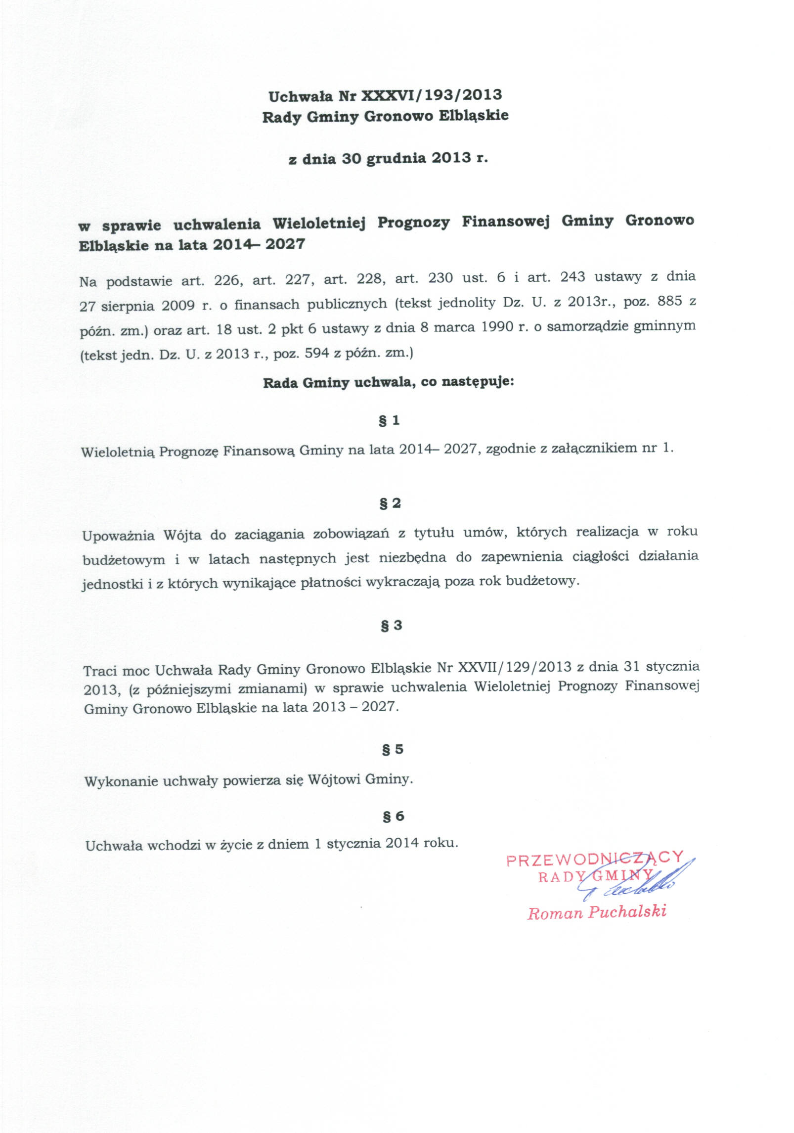 W sprawie uchwalenia Wieloletniej Prognozy Finansowej Gminy Gronowo Elbląskie na lata 2014-2027