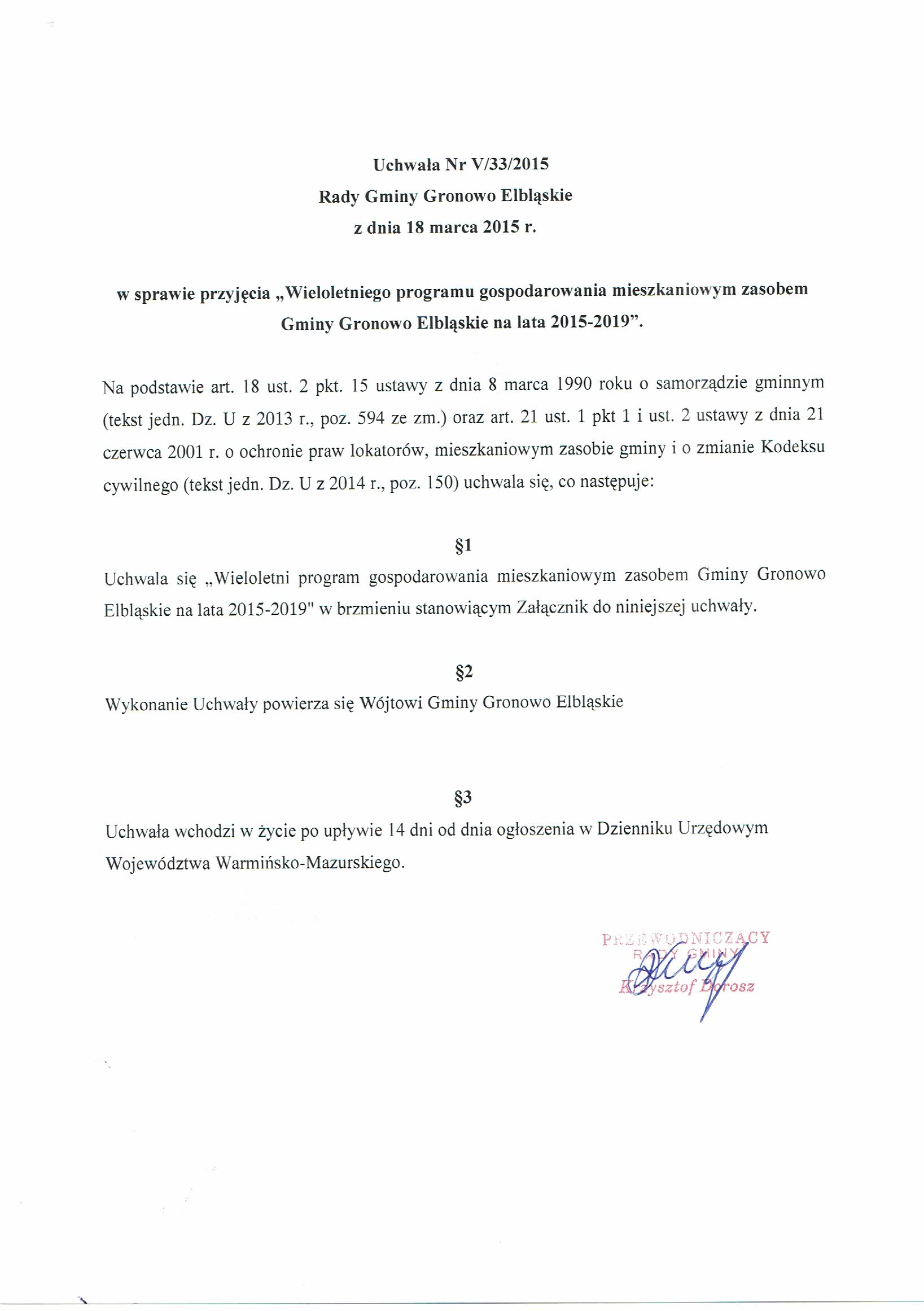 W sprawie przyjęcia „Wieloletniego programu gospodarowania mieszkaniowym zasobem Gminy Gronowo Elbląskie na lata 2015-2019”