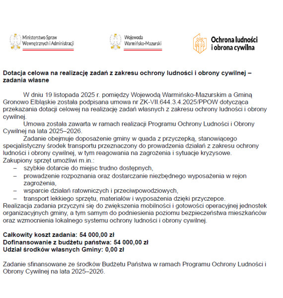 Wersja obowiązująca z dnia 27-11-2025 09:55:20 Drukuj Dotacja celowa na realizację zadań z zakresu ochrony ludności i obrony cywilnej Załączniki Informacja - Dotacja celowa na realizację zadań z zakresu ochrony ludności i obrony cywilnej format: pdf, rozmiar: 137.36 KB, data dodania: 27-11-2025 09:55:20