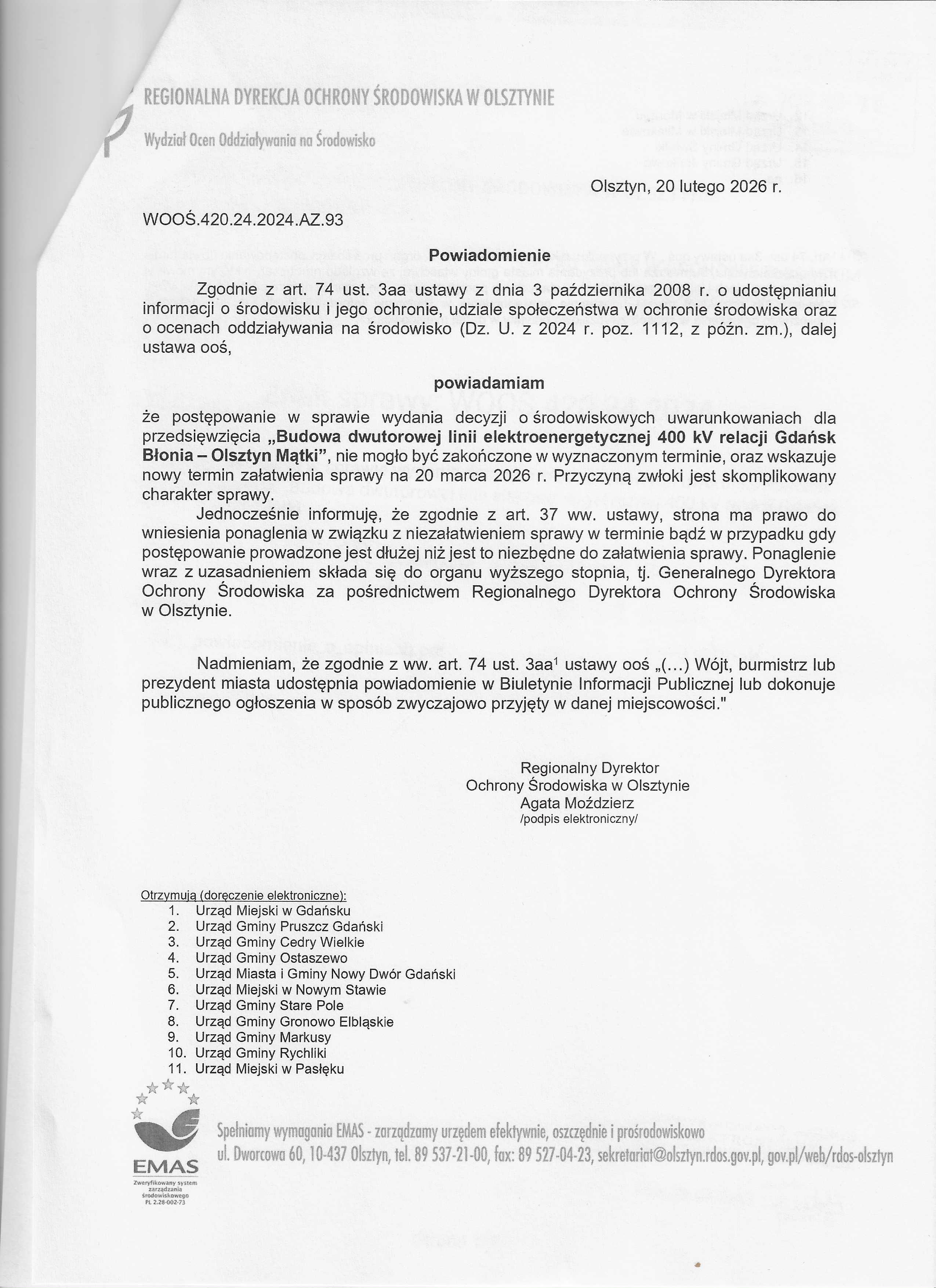 Powiadomienie RDOŚ w Olsztynie znak: WOOŚ.420.24.2024.AZ.93 z dnia 20.02.2026 r. o wydłużeniu terminu załatwienia sparwy dot. wydania decyzji o środowiskowych uwarunkowaniach dla przedsięwzięcia pn.: "Budowa dwutorowej linii elektroenergetycznej 400 kV relacji Gdańsk Błonia- Olsztyn Mątki".