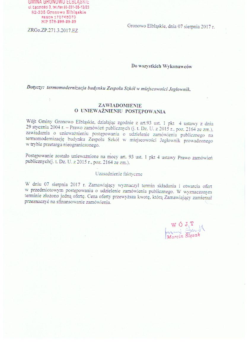 Zawiadomienie o unieważnieniu postępowania z 07.08.2017 r.